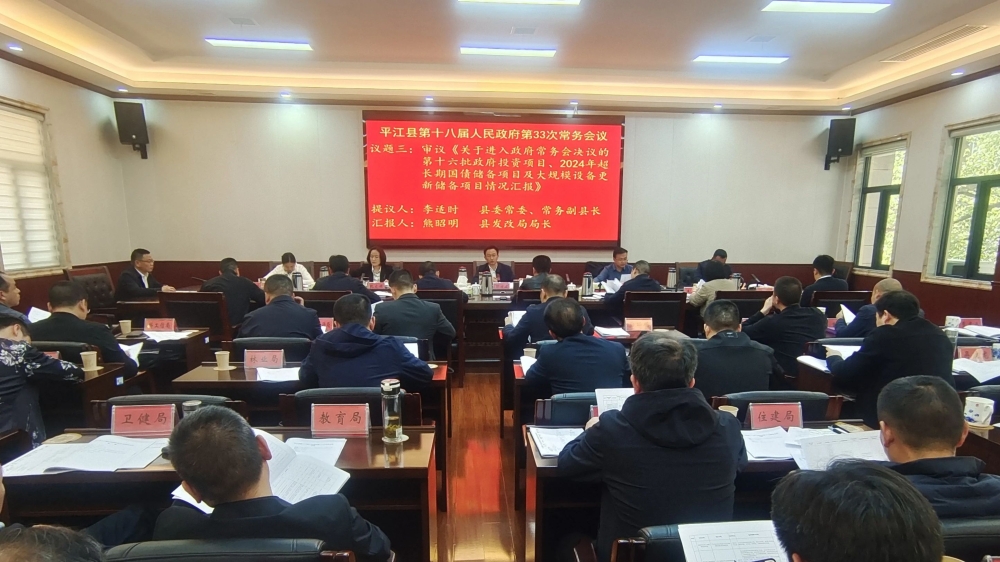 3月26日,县委副书记、县长彭方建主持召开平江县第十八届人民政府第33次常务会议,传达学习习近平总书记在全国两会期间发表的系列重要讲话精神,研究部署安全生产和防汛抗旱等工作,审议实施“八大行动”等工作方案和相关协议合同。