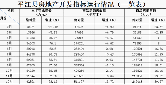 2018年,平江县房地产商品房销售面积除6、8、10、12月呈现增长态势外,其他月份均实现负增长,排位在全市靠后。对我县整个房地产运行影响较大。