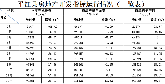 2018年,平江县房地产商品房销售面积除6、8、10、12月呈现增长态势外,其他月份均实现负增长,排位在全市靠后。对我县整个房地产运行影响较大。