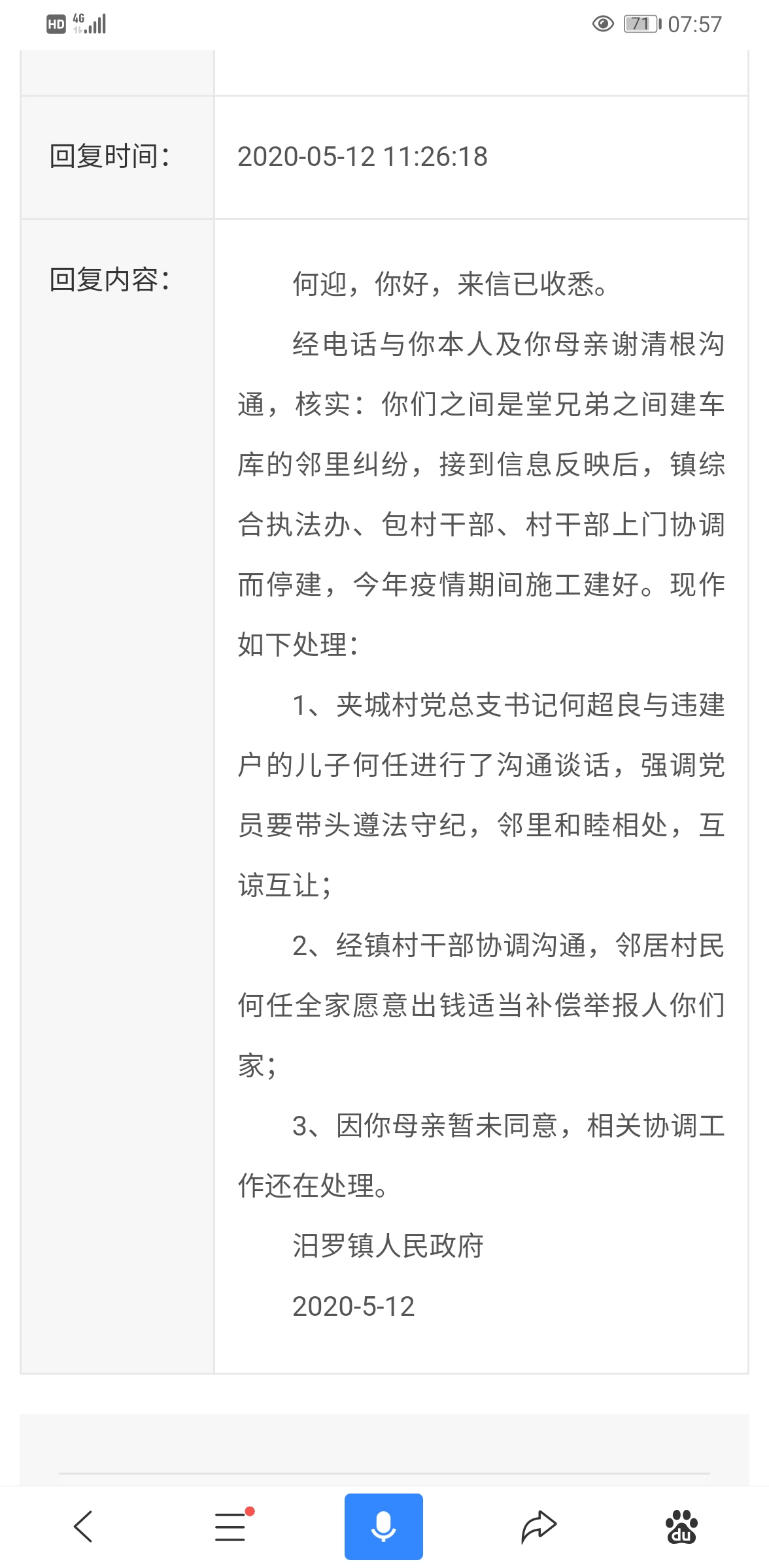 经电话与当事人何迎及母亲谢清根沟通,核实:他们之间是堂兄弟之间建车库的邻里纠纷,接到信息反映后,镇综合执法办、包村干部、村干部上门协调而停建,今年疫情期间施工建好;处理:1、夹城村党总支书记何超良与违建户的儿子何任进行了沟通谈话,强调党员要带头遵法守纪,邻里和睦相处,互谅互让;2、经镇村干部协调沟通,邻居村民何任全家愿意出钱适当补偿举报人何迎家;3、因举报人何迎母亲暂未同意,相关协调工作正在处理。汨罗镇人民政府。2020-5-12。这个回复政府有点敷衍了事。