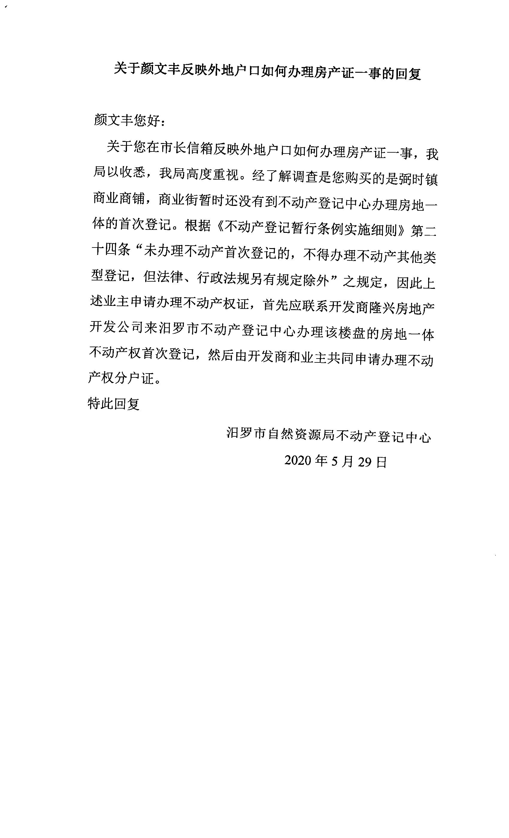 | 再次回复: | 颜文丰,你好,您二次反馈的问题,经我中心再次确认,目前开发商未办理该楼盘房地一体不动产手续登记。 |