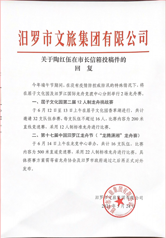 | 回复内容: | 网友,您好! 来信已收悉,现回复如下: 今年端午期间,在没有疫情防控或防汛的特殊情况下,将在屈子文化园及汨罗江国际竞渡中心分别举行2场龙舟赛,详情见附件。 汨罗市文旅集团有限公司 2021年5月24日