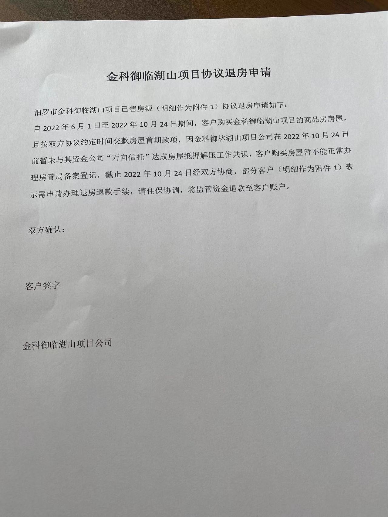 尊敬的汨罗市人民政府各位领导: 本人冯海波今年2022.6.24在汨罗金科御临湖山项目销售部购买了6号栋1301户型,并缴纳了首付款和欠了房屋购买合同,银行贷款面签手续都细办好。可迟迟到今天,我们购房者贷款手续却一直办理不下来(原因是金科向我们出售的是抵押房项目,)在购房之前没有金科销售,负责人并没有事先告知我们这是抵押房,如今四个月过去了.我们农民进城辛辛苦苦凑来买房交的首付款,钱也没了,房子也没着落!麻烦恳请各位领导重视(像我这样的购买了金科抵押房的业主大概在30户左右)我们联名向073012345市长热线反映了这个问题,一直没有答复。 |
