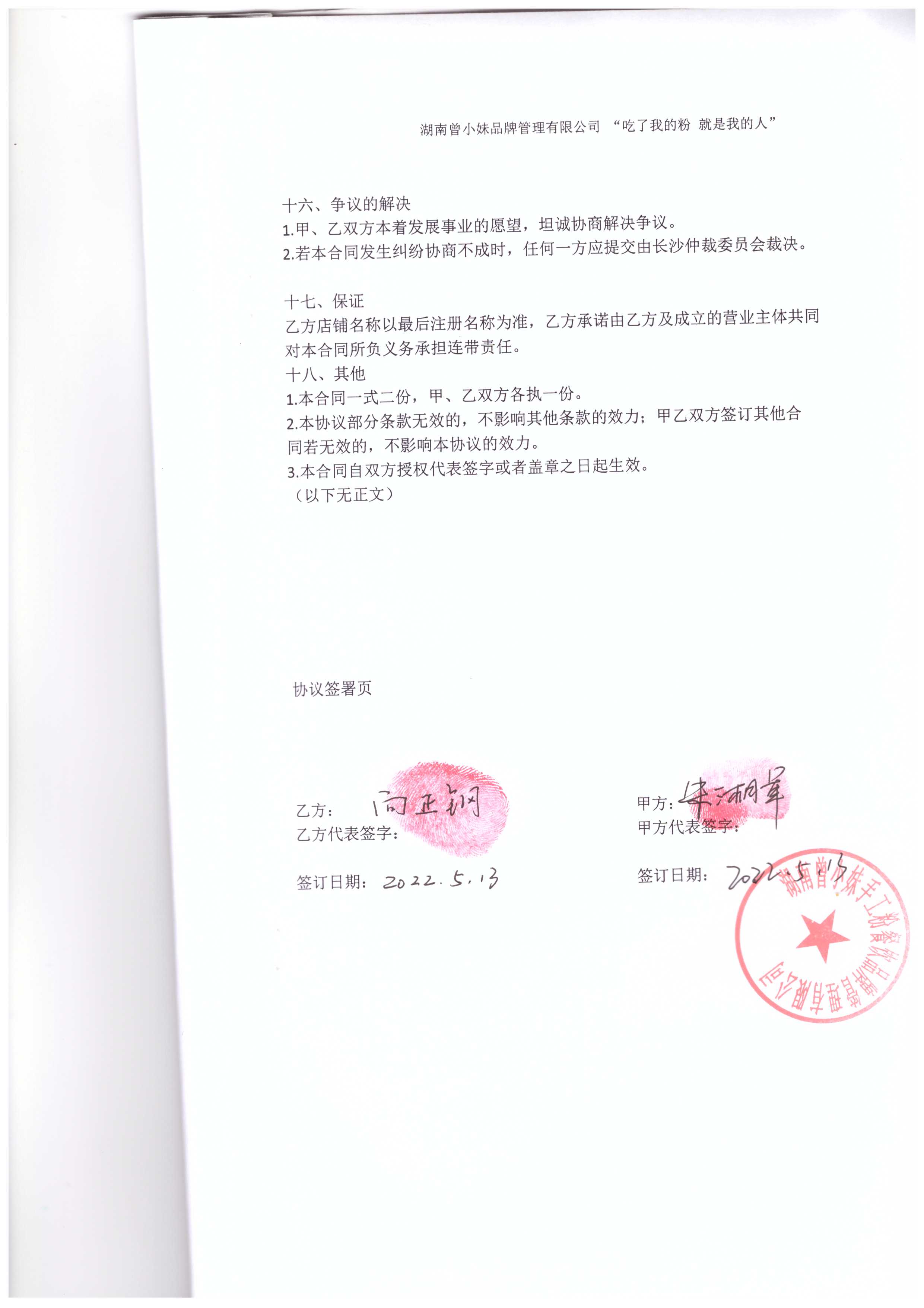本人于2022年5月13日加盟贵局管辖范围的汨罗市“曾小妹手工粉”该品牌所属“湖南曾小妹手工粉餐饮品牌管理有限公司”法人:朱湘军 手机号:15116462869,同期加盟的有平江县的伍市店,平江店、长乐店、岳阳店、湘阴店、营田店,因经营严重亏损于2023年5-31日停止营业最终亏损达62万元,同期加入的店加盟商平时沟通得知基本都是亏损,因此我对该公司的是否有能力并具备招商加盟资质产生了怀疑,多次要求该公司出示“特许经营许可证“遭到拒绝,因此特向监管部门提出查验。 如该公司在我加盟时确无招商加盟资质,我诉求该公司退回我的加盟费用39800元及押金10000元。 下面我将对该公司招商加盟中的一些有欺骗性的方式进行罗列请求监管部门依法查处: 1、