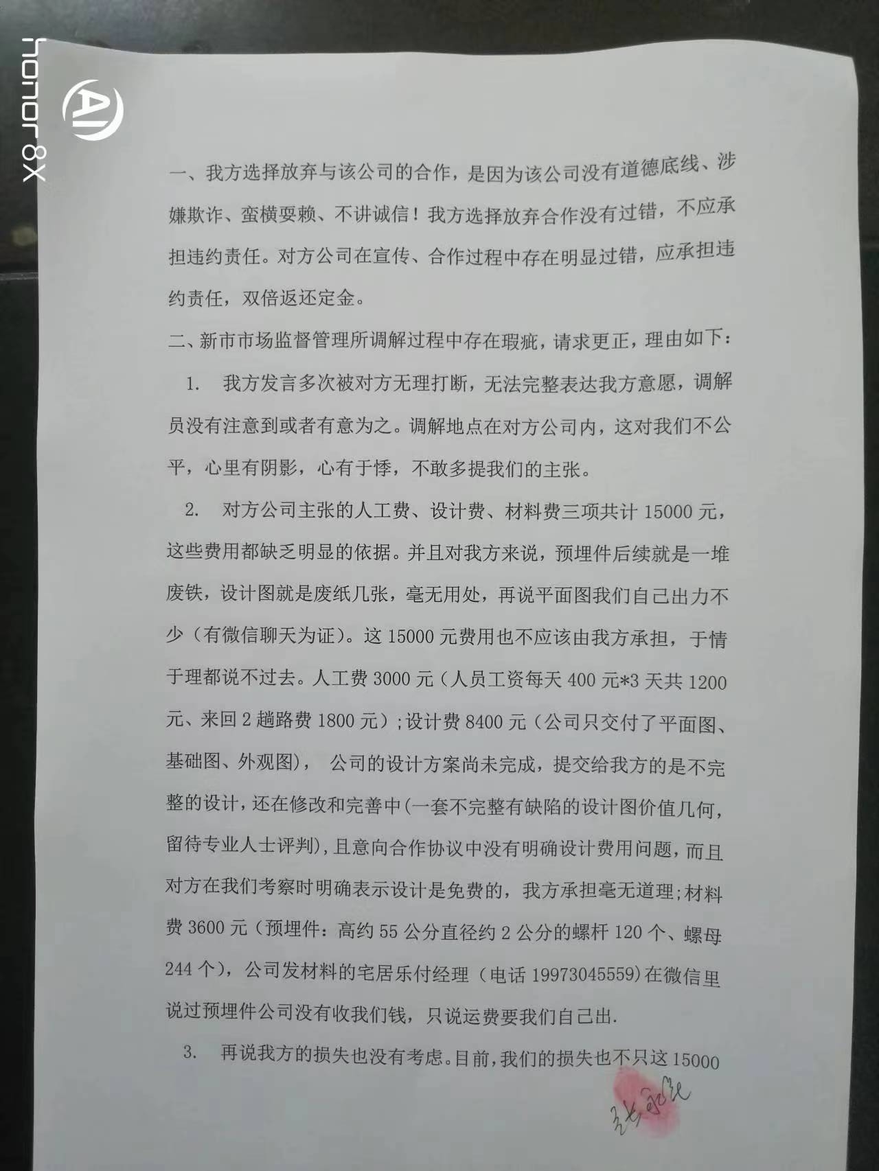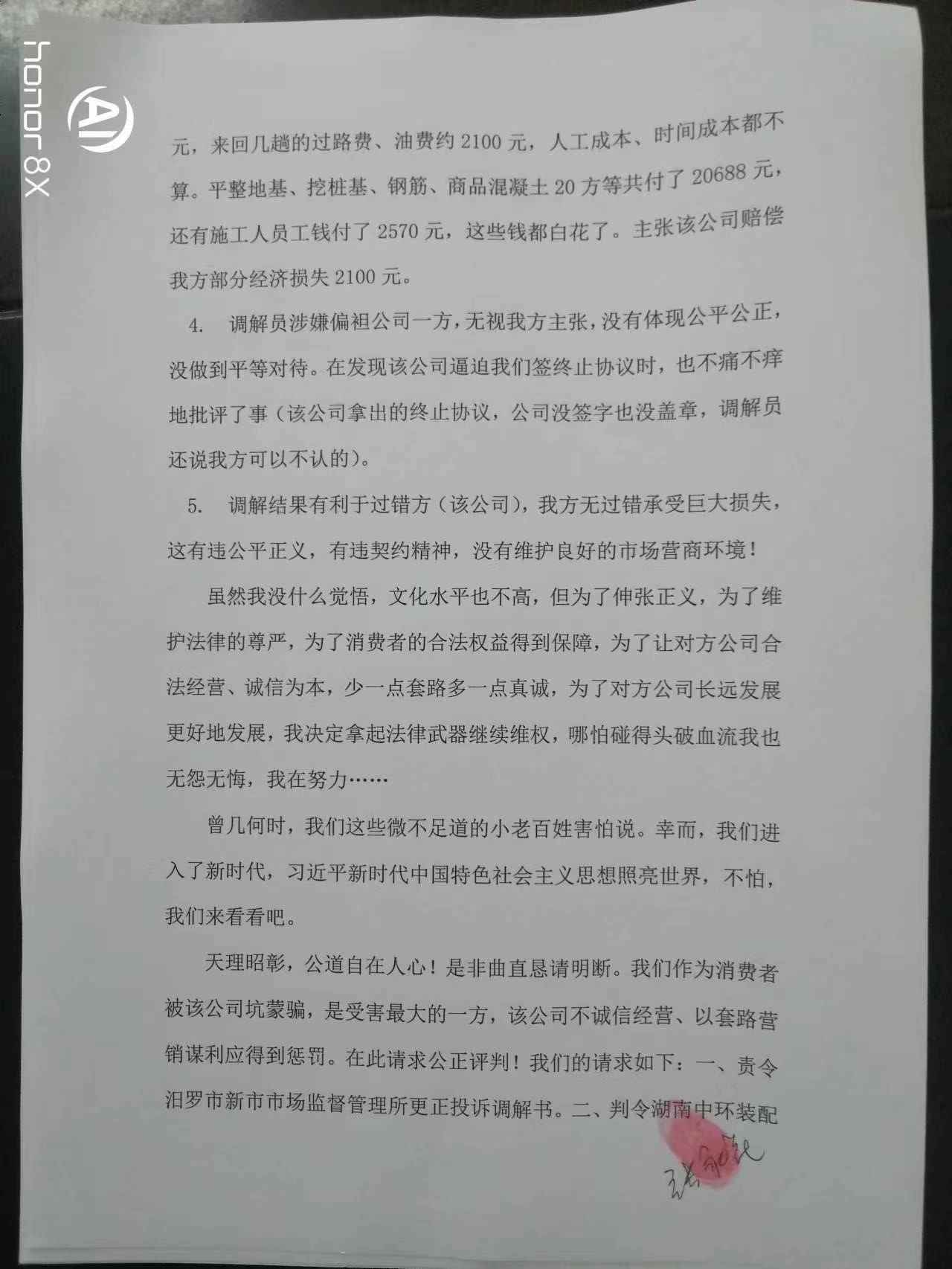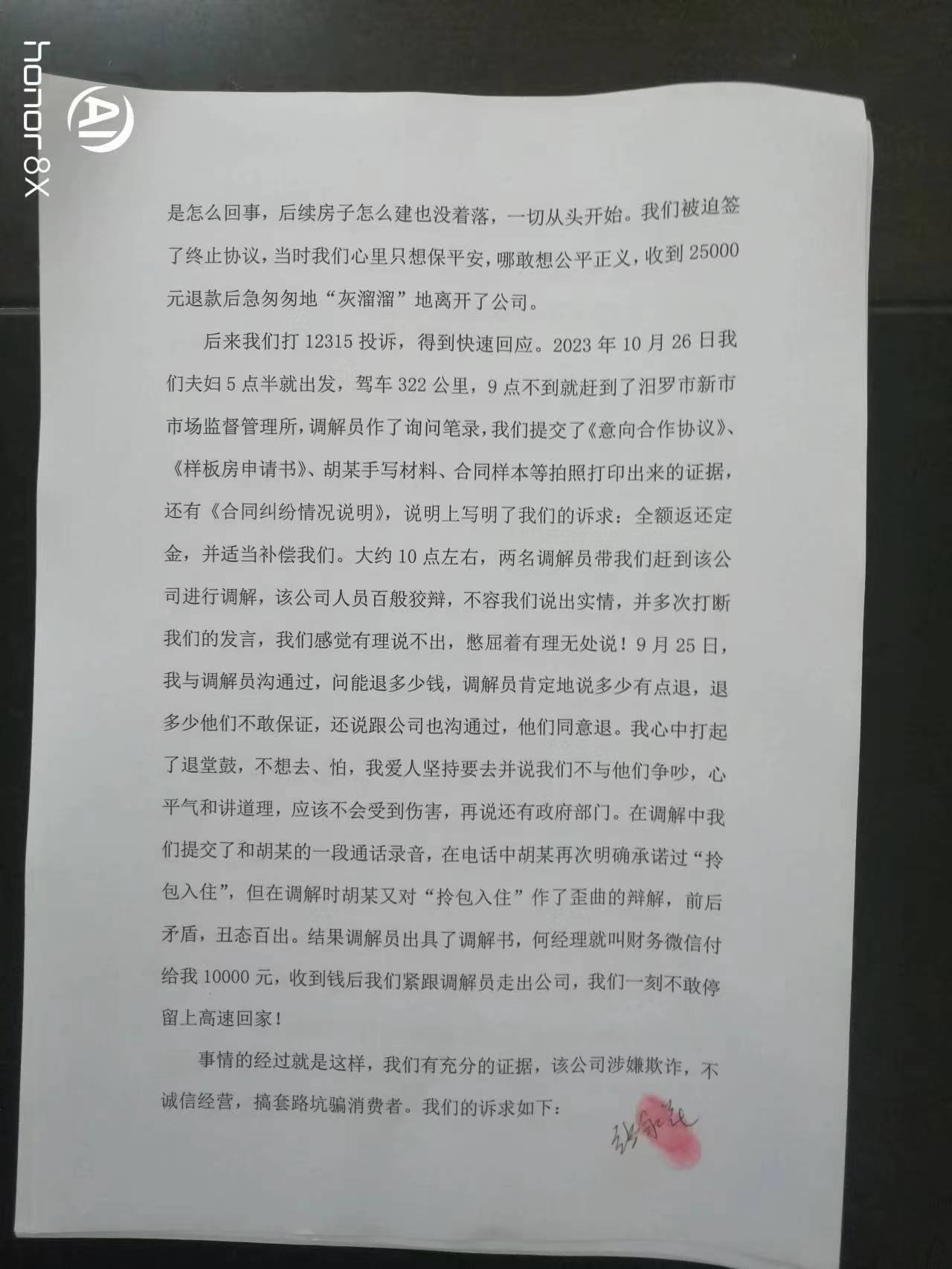 市长大人:您好!在您百忙之中给您添麻烦了!我叫张永花,是湖南省常宁市人,我不该轻信抖音小视频的误导宣传,被您辖区内的湖南中环装配建筑工程有限公司骗走1.5万元!该公司虚假宣传套路营销不知道蒙骗了多少消费者,我们只是其中之一。新市市场监督管理所在调解过程中,没能做到公正公平,做出了侵害我方合法权益的调解,涉嫌偏袒对方公司,我不知道怎么办,感觉状告无门,无助的感觉有谁懂!现申请行政复议,托您转交有关部门,在此万分感谢您! 行政复议申请书 申请人:姓名 张永花 性别 女 出生年月 1974年3月 身份证号码 43042519740320**** 工作单位 常宁市第五人民医院 住所 常宁市王家园南一区金溪公寓 邮政编码421500 电话1521137**** 委托代理人: 姓名 周春林 电话1378645**** 被申请人:名称 汨罗市新市市场监督管理所 行政复议请求: 一、撤销汨罗市新市市场监督管理所投诉调解书第一条对当事人张永花扣除15000元费用的调解内容和第二条双方再无利害关系。二、请求有关部门帮助要回湖南中环装配建筑工程有限公司套路营销骗去的15000元。 事实和理由: 2023年9月12日,我们夫妇和亲友一行5人到达位于汨罗市工业园区内的湖南中环装配建筑工程有限公司进行考察,该公司胡某一番花言巧语,承诺样板房1600元/平方建房,承诺拎包入住并送2万元地基补贴(抵现)和3万元软装(送家俱),还有看房奖励和其他合作介绍奖励,我们对参观的重钢建筑很满意,胡某拿出《样板房申请书》、一张A4纸并写下了部分承诺,就叫我们签字。我们提议拿合同过来先看一下,结果胡某拿了一份材料清单说要先勘察好现场、出了施工图纸后才有合同,我们说这有什么用,他说他写的就是承诺相信他。然后我们一起去财务室交钱,5万元分两笔付到该公司帐户,财务人员开好收据。交谈中胡某叫我签字,有样板房申请书、胡某手写材料,我签好后,财务又递过来一张纸,胡某填写后交给我签字,我当时没看直接就签了,也就没注意到签字的内容是什么。期间胡某也没特意说明签什么字及内容,原来是意向合作协议,我们都没注意到,还沉浸在重钢建房的美梦中。胡某采用不正当不道德的手段蒙骗我们,趁我们毫无防备没有警觉麻痹大意签订《意向合作协议》。 2023年10月17日我们一家3人又到该公司商谈合作,准备签合同,胡某拿出的到处是坑的合同来套路我们,我们提出异议,胡某要我们把所有的问题提出来帮我们解决,我们指出了合同中太多的问题我们据理力争,该公司出尔反尔,全盘否定之前的承诺,耍赖蛮横不讲理,我们选择中止合作,胡某还说公司有损失要我们再交钱(我们与胡某谈合作全程有录音为证,合作谈不下去了过错完全在对方不讲诚信)。我们很气愤就出来了,公司四、五个年轻力壮的小伙子拦住我们要求协商,一个穿竖条纹衬衫的男子说他是领导可以作主,七嘴八舌有点乱,我们不知所措。后何经理(电话:1989888****)跨出来对我们大声说他可以作主,叫我老公去协商,我和我儿子战战兢兢心中好怕在门口等,我儿子脸都吓白了,我们不知怎么办好!我老公说商谈中,只有何经理一而再地说“听我讲”。后来我老公跟我说退2万5,我心里想谢天谢地平安就好!就又签了一份什么书,内容不记得了,也没细看,他们公司又要银行帐户,说转帐用,后财务微信转给我2万5千元整。何经理又要过我们的手机,删除了通信记录等。说起来,公司蒙骗我们,我们是最大的受害者,钱花了都不知道是怎么回事,后续房子怎么建也没着落,一切从头开始。我们被迫签了终止协议,当时我们心里只想保平安,哪敢想公平正义,收到25000元退款后急匆匆地“灰溜溜”地离开了公司。 后来我们打12315投诉,得到快速回应。2023年10月26日我们夫妇5点半就出发,驾车322公里,9点不到就赶到了汨罗市新市市场监督管理所,调解员作了询问笔录,我们提交了《意向合作协议》、《样板房申请书》、胡某手写材料、合同样本等拍照打印出来的证据,还有《合同纠纷情况说明》,说明上写明了我们的诉求:全额返还定金,并适当补偿我们。大约10点左右,两名调解员带我们赶到该公司进行调解,该公司人员百般狡辩,不容我们说出实情,并多次打断我们的发言,我们感觉有理说不出,憋屈着有理无处说!9月25日,我与调解员沟通过,问能退多少钱,调解员肯定地说多少有点退,退多少他们不敢保证,还说跟公司也沟通过,他们同意退。我心中打起了退堂鼓,不想去、怕,我爱人坚持要去并说我们不与他们争吵,心平气和讲道理,应该不会受到伤害,再说还有政府部门。在调解中我们提交了和胡某的一段通话录音,在电话中胡某再次明确承诺过“拎包入住”,但在调解时胡某又对“拎包入住”作了歪曲的辩解,前后矛盾,丑态百出。结果调解员出具了调解书,何经理就叫财务微信付给我10000元,收到钱后我们紧跟调解员走出公司,我们一刻不敢停留上高速回家! 事情的经过就是这样,我们有充分的证据,该公司涉嫌欺诈,不诚信经营,搞套路坑骗消费者。我们的诉求如下: 一、我方选择放弃与该公司的合作,是因为该公司没有道德底线、涉嫌欺诈、蛮横耍赖、不讲诚信!我方选择放弃合作没有过错,不应承担违约责任。对方公司在宣传、合作过程中存在明显过错,应承担违约责任,双倍返还定金。 二、新市市场监督管理所调解过程中存在瑕疵,请求更正,理由如下: 1. 我方发言多次被
