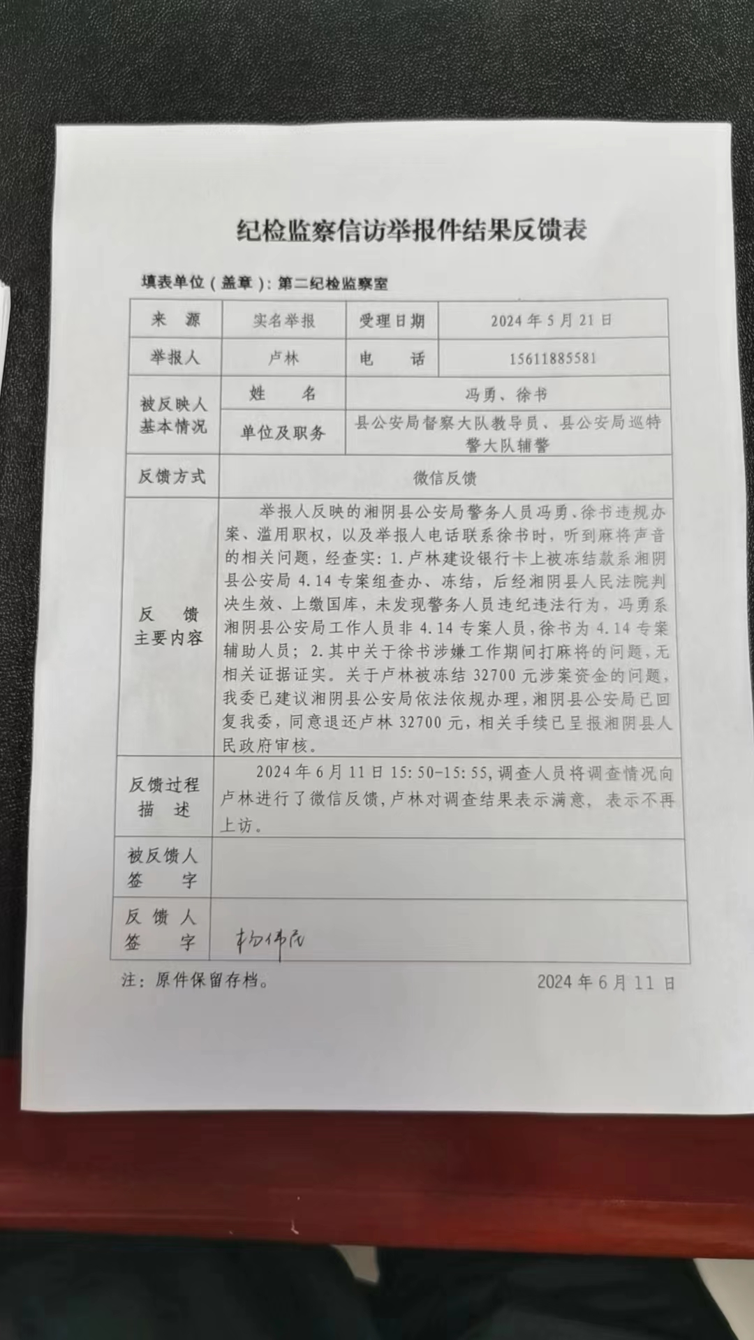 实名举报汨罗警方存在滥用职权行为 要求依法依规退还我个人存款 被冻结的建行卡号:6217 0006 6000 5494 500 持卡人姓名:卢林 身份证号:21120219790414**** 联系电话:156 1188 5581 事情经过: 我这个建行卡是当时在碧桂园物业上班,入职后单位需要一张建行卡,用于每月开工资,我这个银行卡除了疫情期间,用于游戏代练,平时还有过一些网上购物,都是有记录可查的,我没有参与赌博,我也没有违法,我是在疫情期间从事网络游戏代练工作,代练的游戏是一款国际网游《大海战》,沟通都是在YY语音和一个网页版的语音聊天软件Skype,当初只管刷单挣钱,有支出是需要买账号,然后代练,再卖出,谁也没想到日后会涉案,而且都是好几年前的事了,大海战是国际服务器,游戏里有很多外国人,当时代练的时候我也问过,为什么练这么多游戏账号?对方说以后想组一个舰队,日后打比赛打港战的时候备用,其他我没有想太多,我只是代练挣我的钱就行了。 汨罗警察冻结我的银行卡,没有告知当事人,也没有给我看过冻结文书,我到银行网点查询,也查询不到冻结原因和警方的联系方式,几经周折才联系到办案人员,办案程序不合规。 我卡里的32700元是早在一年前是被岳阳湘阴县警方冻结的,我向湘阴县警方提交了钱款来源证明,并经过多次上访,在岳阳市纪检委的介入下,湘阴县警方同意退还到我的银行卡,刚退回来又被岳阳汨罗警方冻结走了,我与汨罗警方取得联系,并提交了相关证明,汨罗警方在信访回复中说:“我提交的材料无法证明我卡内资金的合法性,”不予解冻,不予退还,并声称要送法院处理,汨罗警方的意思,岳阳市纪检委和湘阴县警方协助我作假吗? 警方办案要有法律依据,钱款来源是清楚的,跟赌博没关系,凭什么将我的个人存款已送到法院处理,这不合法,也不合规。 汨罗警方在案件办理和信访答复中,歪曲事实,对重大的事实和证据,不予依法认定,滥用职权,做出错误的信访回复。 我拖欠的房贷急需处理,老人看病也需要费用,这些钱对我来说是救命钱,是我个人存款,扣我一年了至今不归还与我,严重影响老百姓正常生活,我将被迫向国家纪检委、国家公安部、国家信访局实名举报。 附件1:岳阳市纪检委信访处理回复.jpg |