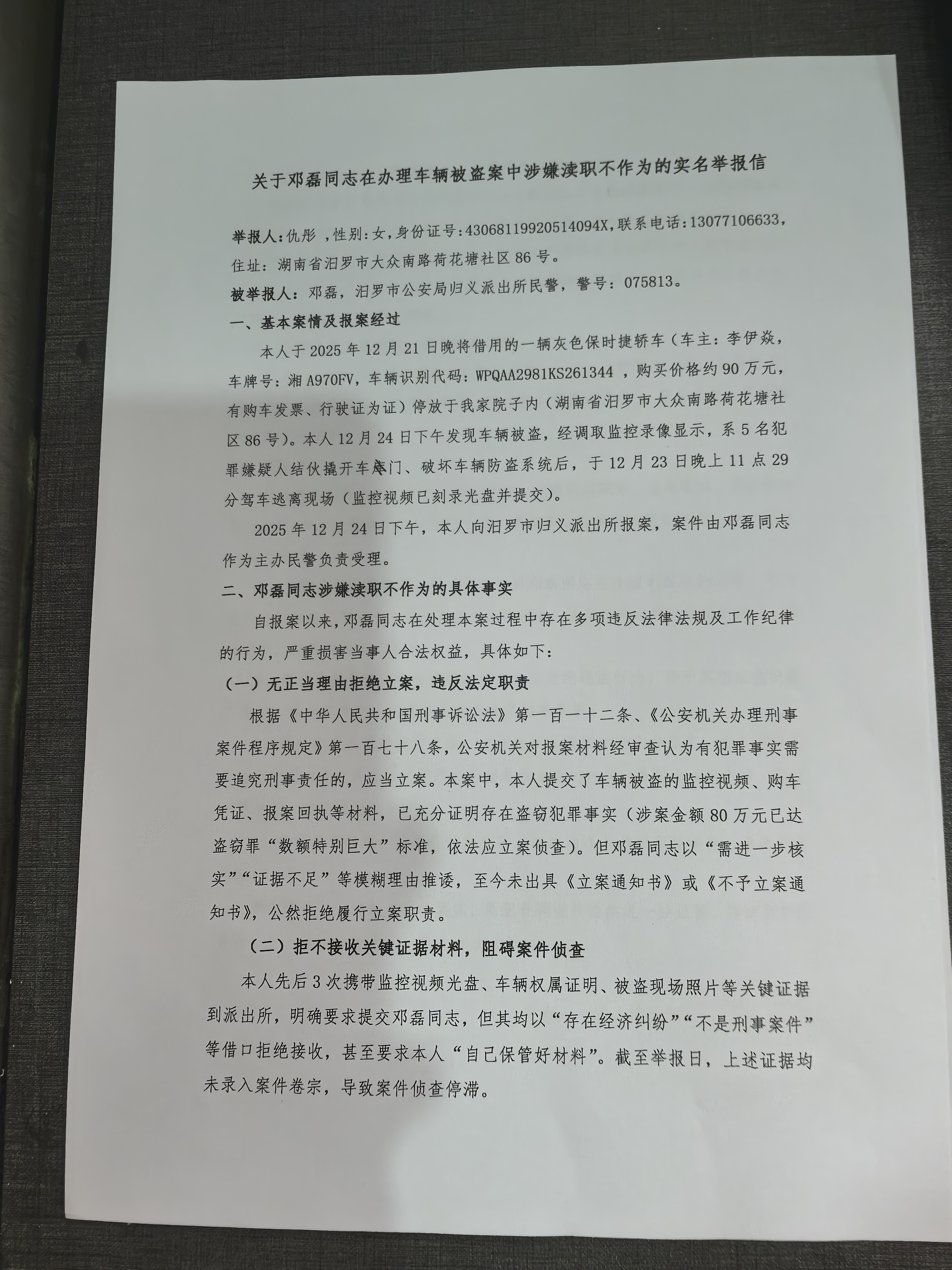 标题: 关于邓磊同志在办理车辆被盗案中涉嫌渎职不作为的实名举报