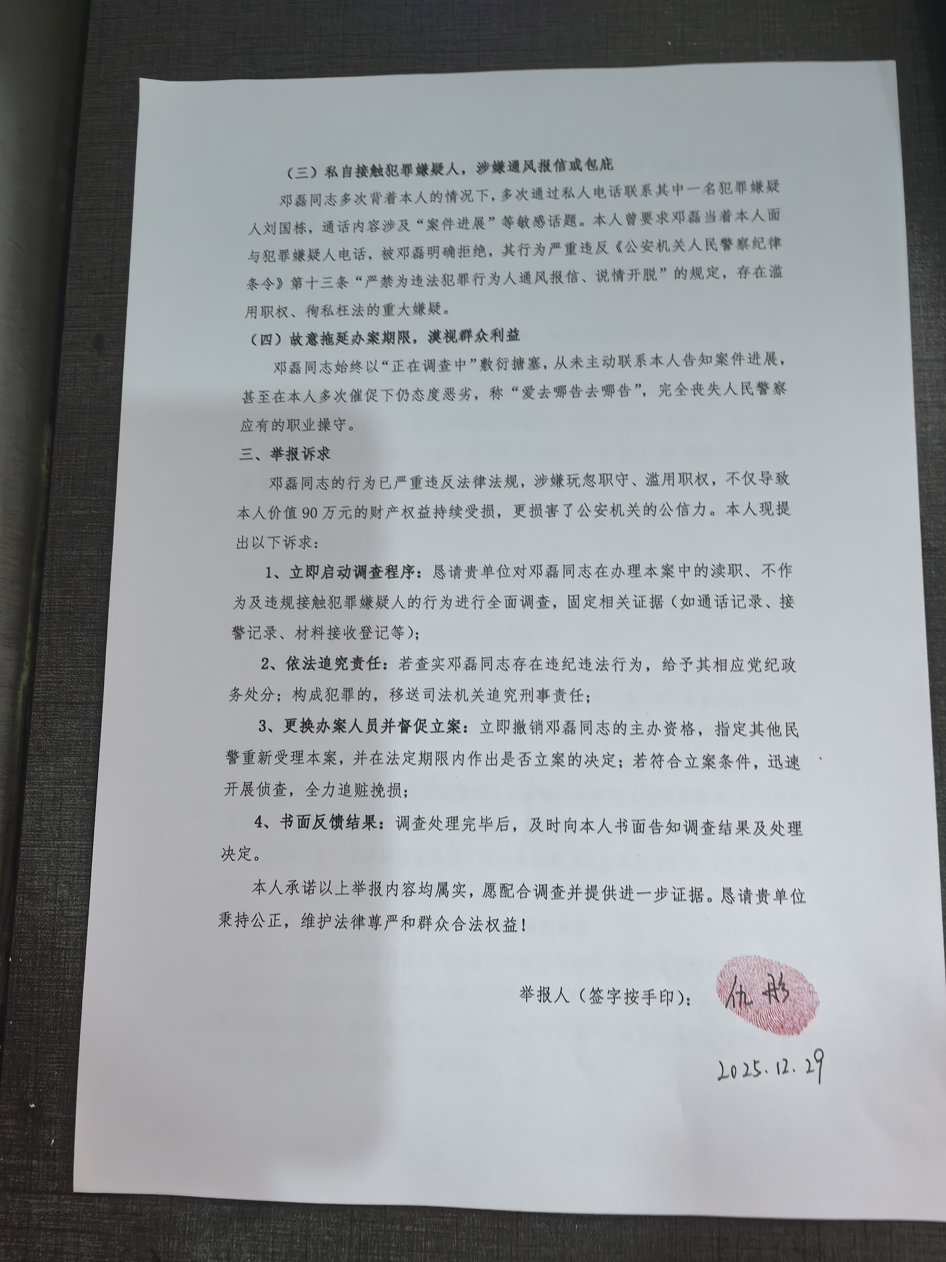 邓磊同志的行为已严重违反法律法规,涉嫌玩忽职守、滥用职权,不仅导致本人价值90万元的财产权益持续受损,更损害了公安机关的公信力。本人现提出以下诉求: