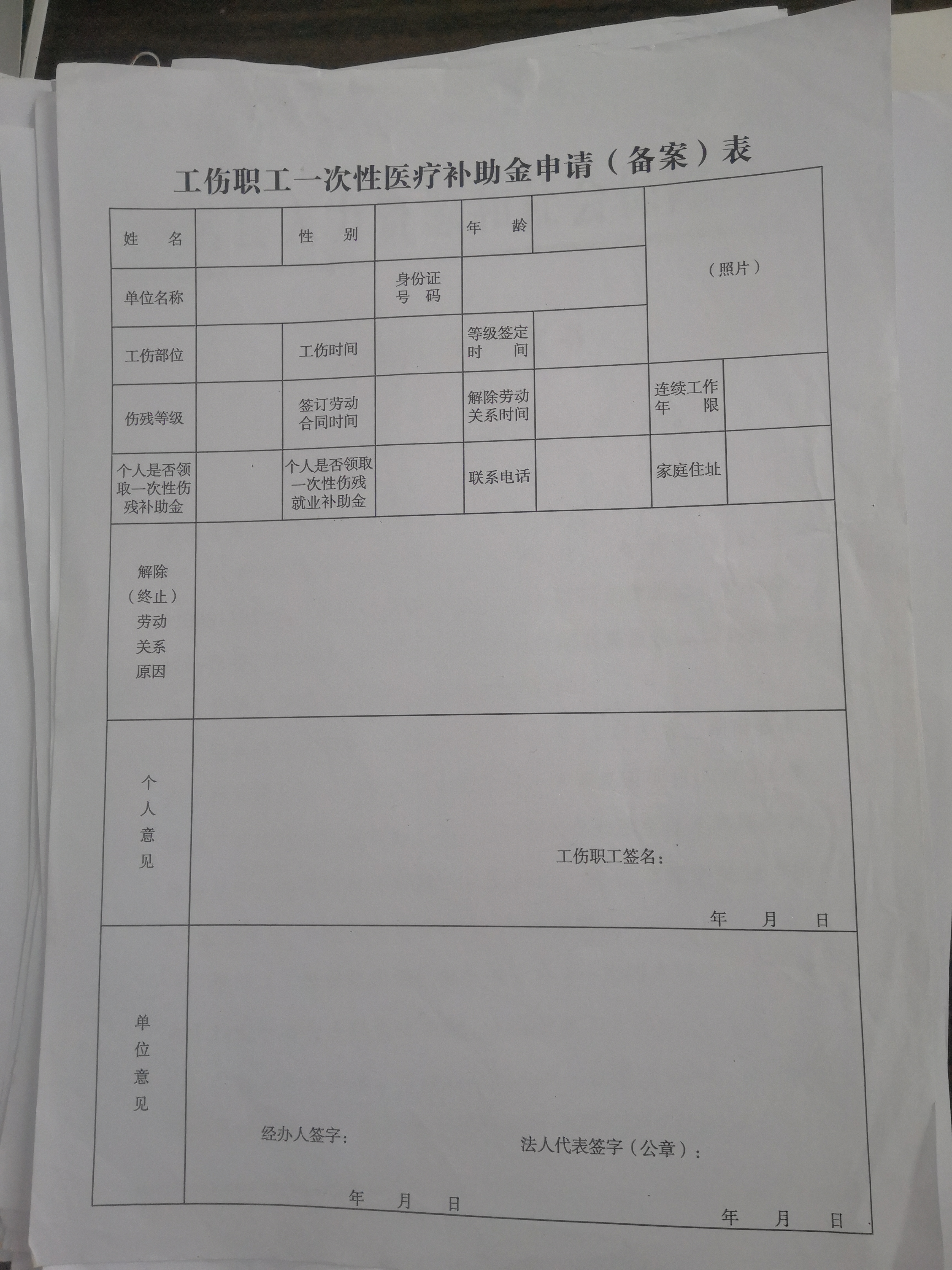 2、那个 工伤职工一次性医疗补助金申请(备案)表  这个有网上的下载地址吗?因为我在长沙,去一次你们那边有点麻烦,我想这边打印了然后邮寄给公司那边去。
