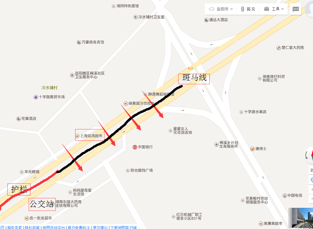 2.采取措施:2017年11月22日上午,交警支队组织公交公司、绿化、安检等部门到冷水铺红绿灯路口进行了调研。交警部门的建议,一是将公交站向南侧移70米左右,把现在的公交站硬化成道路;二是缩小红绿灯南侧中心隔离护栏的开口,在红日机械厂路段附近增设一护栏掉头开口;三是将红绿灯附近的中心护栏改为高护栏。但因牵涉的部门较多,整改要一定的过程,交警部门会督促整改到位。目前,交警城陵矶大队已加派了警力在路口执勤。