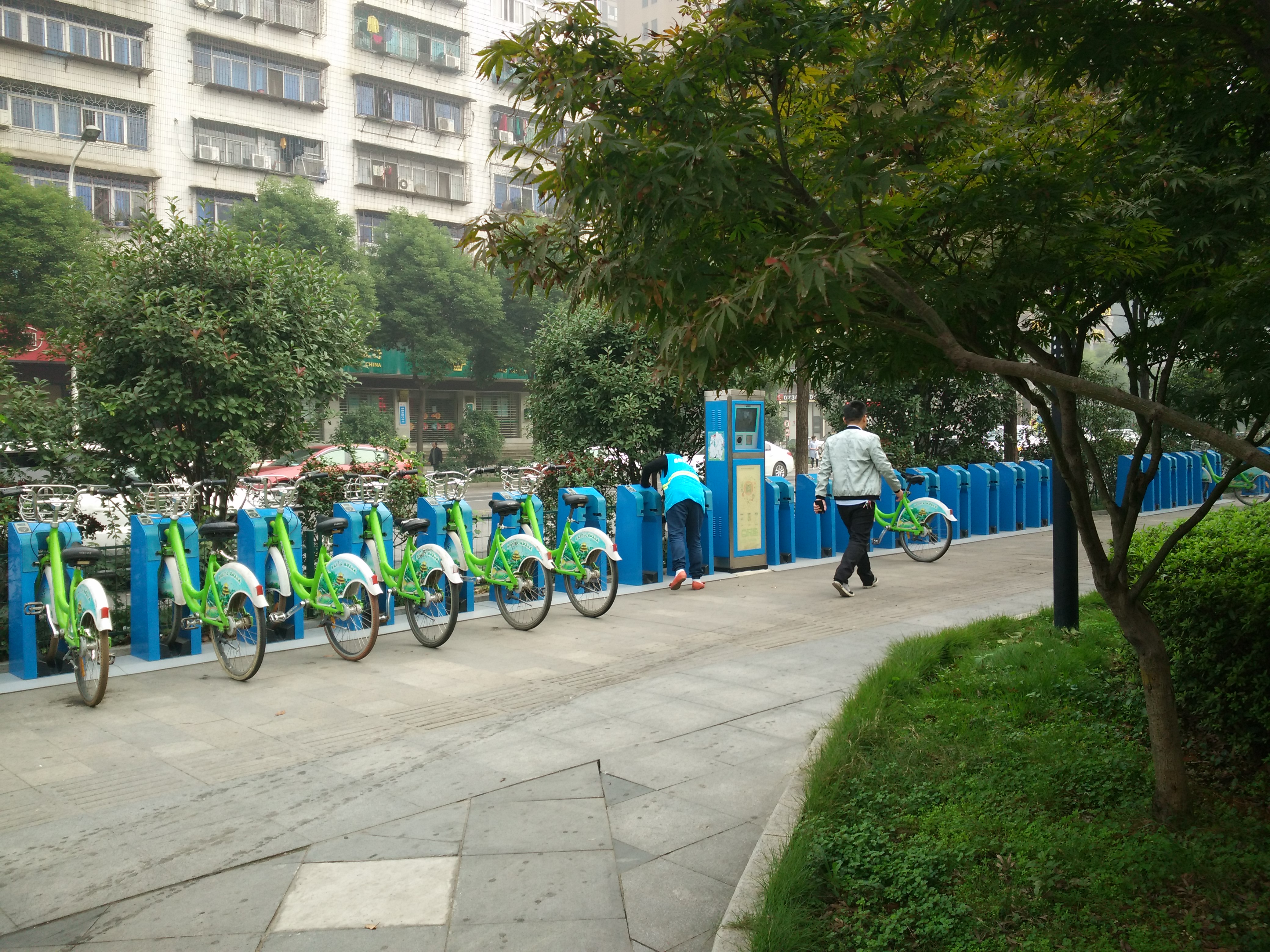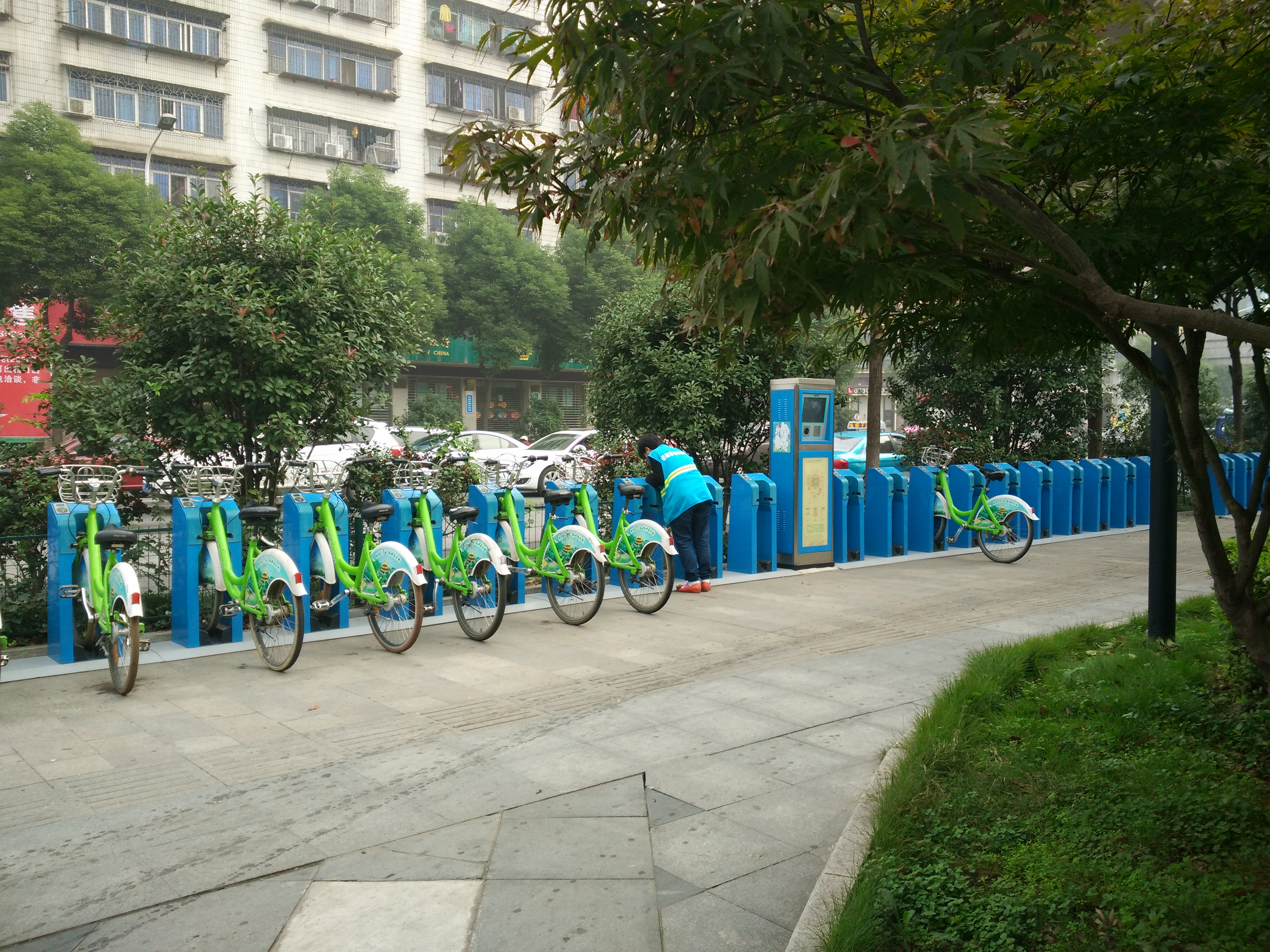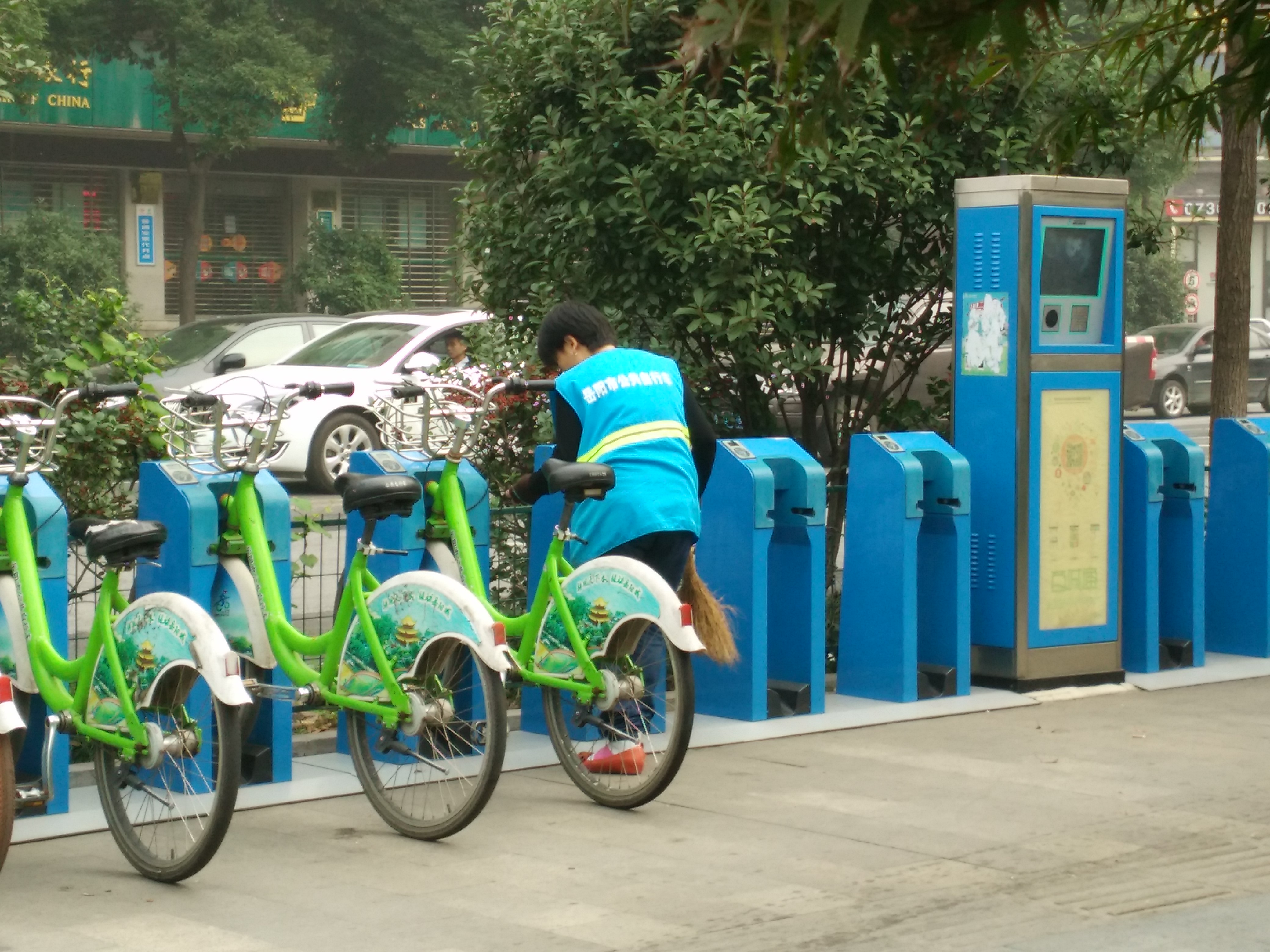 我早晨路过大润发共享单车停车桩,看到勤劳的工作人员穿着整齐的工作服,在清晨的寒风中清扫。拍下了照片,并写下此文。