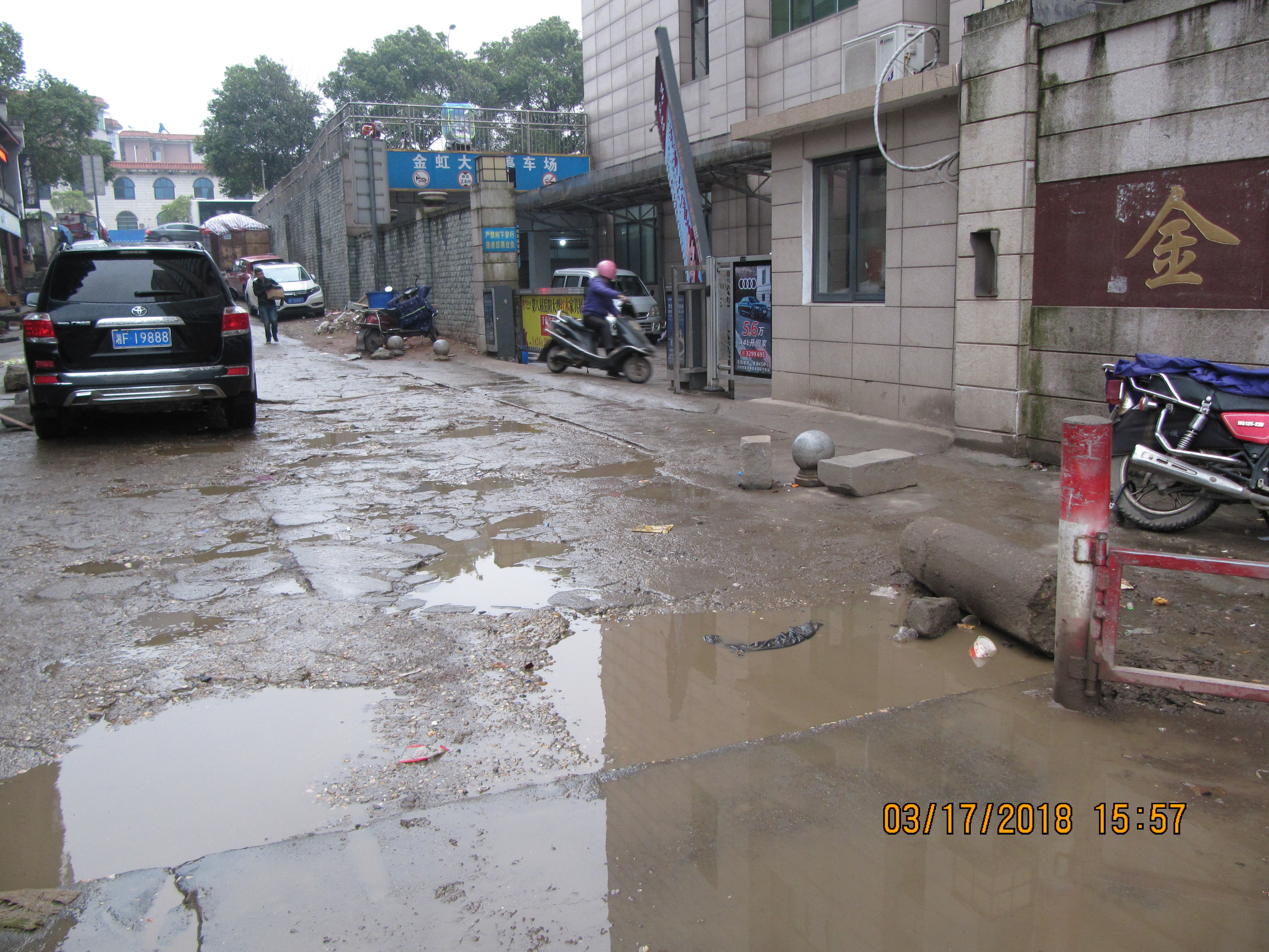 花板桥金虹大厦大门前一条路,自住进来起到现在已经第八个年头了,这条路一直还是破烂不堪(图片附后)。不仅严重影响市容,而且对小区内及周边的住户的生活带来极不方便,人们苦不堪言,怨声载道。希望政府有关部门出面督促有关责任人完善。谢谢!