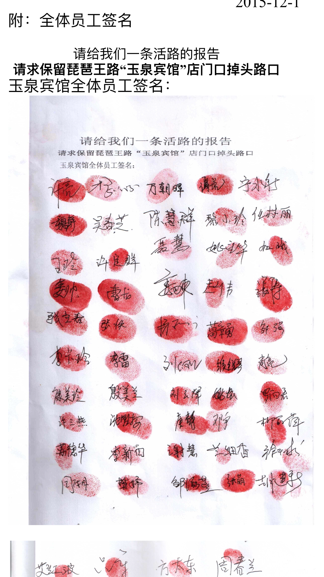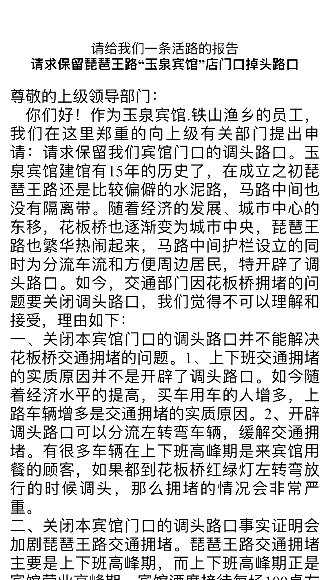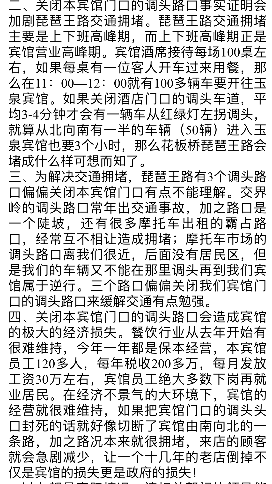 你们好!作为玉泉宾馆.铁山渔乡的员工,我们在这里郑重的向上级有关部门提出申请:请求保留我们宾馆门口的调头路口。玉泉宾馆建馆有15年的历史了,在成立之初琵琶王路还是比较偏僻的水泥路,马路中间也没有隔离带。随着经济的发展、城市中心的东移,花板桥也逐渐变为城市中央,琵琶王路也繁华热闹起来,马路中间护栏设立的同时为分流车流和方便周边居民,特开辟了调头路口。如今,交通部门因花板桥拥堵的问题要关闭调头路口,我们觉得不可以理解和接受,理由如下: