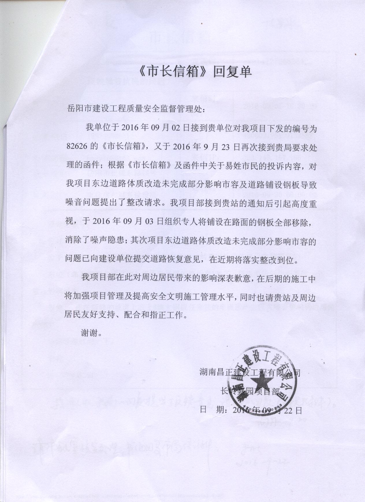 您的反馈意见收悉,我局再次要求市建设工程质量安全监督处进行处理,金威城市广场项目的施工单位湖南昌正建设工程有限公司已于9月3日将铺设在路面的钢板移除,消除了噪声影响。针对您提出该项目东边高坡问题,已督促施工单位进行整改,近期将整改到位。