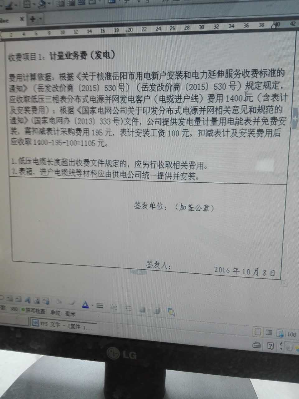 1、在汨罗市电力局(位于汩新大道湖南省电力公司岳阳汨罗电力局)办理光伏发电申请时,工作人员受理申请后,被告知要求支付1105元费用,附件是电力局出具的收费依据。