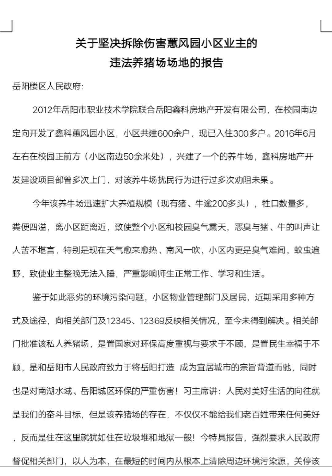 本人是岳阳职院鑫科惠风园的一名普通业主,在鑫科惠风园小区附近直线距离不足100米的地方,有一个养殖场,有养殖猪牛200余头,而猪牛养殖场散发的恶臭味严重影响到小区居民的正常生活,居民、物业多次拨打12345和12369热线进行投诉,但一直毫无改变,该养殖建成于2016年,而小区一期建设竣工时间为2014年,目前该养殖场产生了大量粪便,畜禽粪便中含有大量氮、磷和有机污染物等造成周边区域严重的水质污染,污水对周边居民生活带来极大影响,同时,畜禽粪便经过发酵后会产生大量的氨氮、硫化氢、粪臭素、甲烷等有害气体,不但会破坏生态,还会直接影响人类健康,为此,本人特向相关职能部门做如下请求: 1、根据岳阳市工作部门责任清单,岳阳市环保局负责全市环境污染防治的监督管理,现恳请市环保局工作人员进入小区周围深入调查。 2、根据国家环境保护总局(现中华人民共和国生态环境部)令第9号第十八条 违反本办法规定,有下列行为之一的,由县级以上人民政府环境保护行政主管部门责令停止违法行为,限期改正,并处以1000元以上1万元以下罚款:(一)未采取有效措施,致使储存的畜禽废渣渗漏、散落、溢流、雨水淋失、散发恶臭气味等对周围环境造成污染和危害的;(二)向水体倾倒畜禽废渣的。违反本办法其他有关规定,由环境保护行政主管部门依据有关环境保护法律、法规的规定给予处罚。很明显,该养殖场散发的恶臭味以对周围造成污染,现恳请对该养殖场进行顶格处罚。 3、根据环境保护总局令第9号第七条 禁止在下列区域内建设畜禽养殖场:(一)生活饮用水水源保护区、风景名胜区、自然保护区的核心区及缓冲区;(二)城市和城镇中居民区、文教科研区、医疗区等人口集中地区;(三)县级人民政府依法划定的禁养区域;(四)国家或地方法律、法规规定需特殊保护的其他区域。本办法颁布前已建成的、地处上述区域内的畜禽养殖场应限期搬迁或关闭。恳请市环保局责令该养殖场限期搬迁或关停。 4、2018年5月2日召开的湖南省污染防治攻坚战暨“2018年夏季攻势”动员电视电话会议上,省生态环境保护委员会办公室(简称“省生环办”)主任、省环保厅厅长邓立佳受省委、省政府委托,就打好污染防治攻坚战和“2018年夏季攻势”作了具体部署说明,明确表示将在9月30日前,集中力量解决畜禽(水产)规模养殖场环境污染等10个突出环境问题,重点完成全面整治畜禽(水产)规模养殖场环境污染问题;现恳请市环保局快速、果断处理该起环境违法事件。 5、该养殖场的违法行为以对鑫科惠风园小区居民造成严重影响,有家不能回,有窗不能开的获得感已经深入人心,小区居民已经联名向楼区政府递交关停报告,若不及时处理,容易引发社会不稳定因素,甚至有激动业主提出向市监察委、省环保厅、省长信箱、国家环境生态环境部进行投诉,现恳请市环保局严格执法、执法必严、违法必究,给人民群众一片蓝天白云、青山绿水。党的十九大以来,环境问题一直受到党和国家重点关注,中央环保督查铁腕行动,为了让人民群众有更好的获得感,国家更推出让人民群众到政府办事只跑一次的改革理念,因此,恳请市府重视岳阳职院鑫科惠风园居民的心声。 附件1:uploadfiles/201806/20180608110757999.jpg 附件2:uploadfiles/201806/20180608110805852.jpg 附件3:uploadfiles/201806/20180608110812946.jpg |