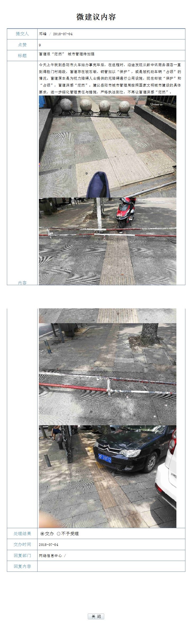 岳阳市政协委员邓峰(139****2801)通过省政协云APP反映:今天上午我到岳阳市火车站办事完毕后,在返程时,沿途发现从新中讯商务酒店一直到得胜门村路段,盲道存在被石墩、钢管加以“保护”,或是被机动车辆“占领”的情况。盲道原本是为视力障碍人士提供的无障碍通行公用设施,现在却被“保护”和“占领”,盲道深感“茫然”。建议岳阳市城市管理局按照国家文明城市建设的具体要求,进一步细化管理责任与措施,严格执法到位,不再让盲道深感“茫然”。 |