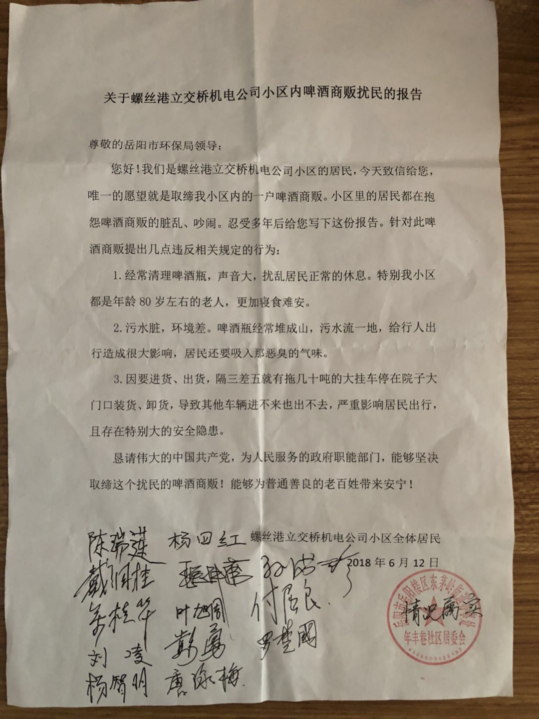 关于螺丝港立交桥机电公司小区内啤酒商贩扰民的报告 尊敬的岳阳市环保局领导: 您好!我们是螺丝港立交桥机电公司小区的居民,今天致信给您,唯一的愿望就是取缔我小区内的一户啤酒商贩。小区里的居民都在抱怨啤酒商贩的脏乱、吵闹。忍受多年后给您写下这份报告。针对此啤酒商贩提出几点违反相关规定的行为: 1.经常清理啤酒瓶,声音大,扰乱居民正常的休息。特别我小区都是年龄80岁左右的老人,更加寝食难安。 2.污水脏,环境差。啤酒瓶经常堆成山,污水流一地,给行人出行造成很大影响,居民还要吸入那恶臭的气味。 3.因要进货、出货,隔三差五就有拖几十吨的大挂车停在院子大门口装货、卸货,导致其他车辆进不来也出不去,严重影响居民出行,且存在特别大的安全隐患。 4. 社区居住人员多次打12345都没有人来进行处理。 恳请伟大的中国共产党,为人民服务的政府职能部门,能够坚决取缔这个扰民的啤酒商贩!能够为普通善良的老百姓带来安宁! 螺丝港立交桥机电公司小区全体居民 2019年5月7日 |