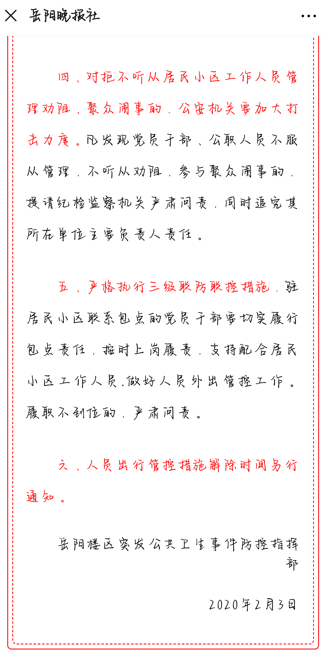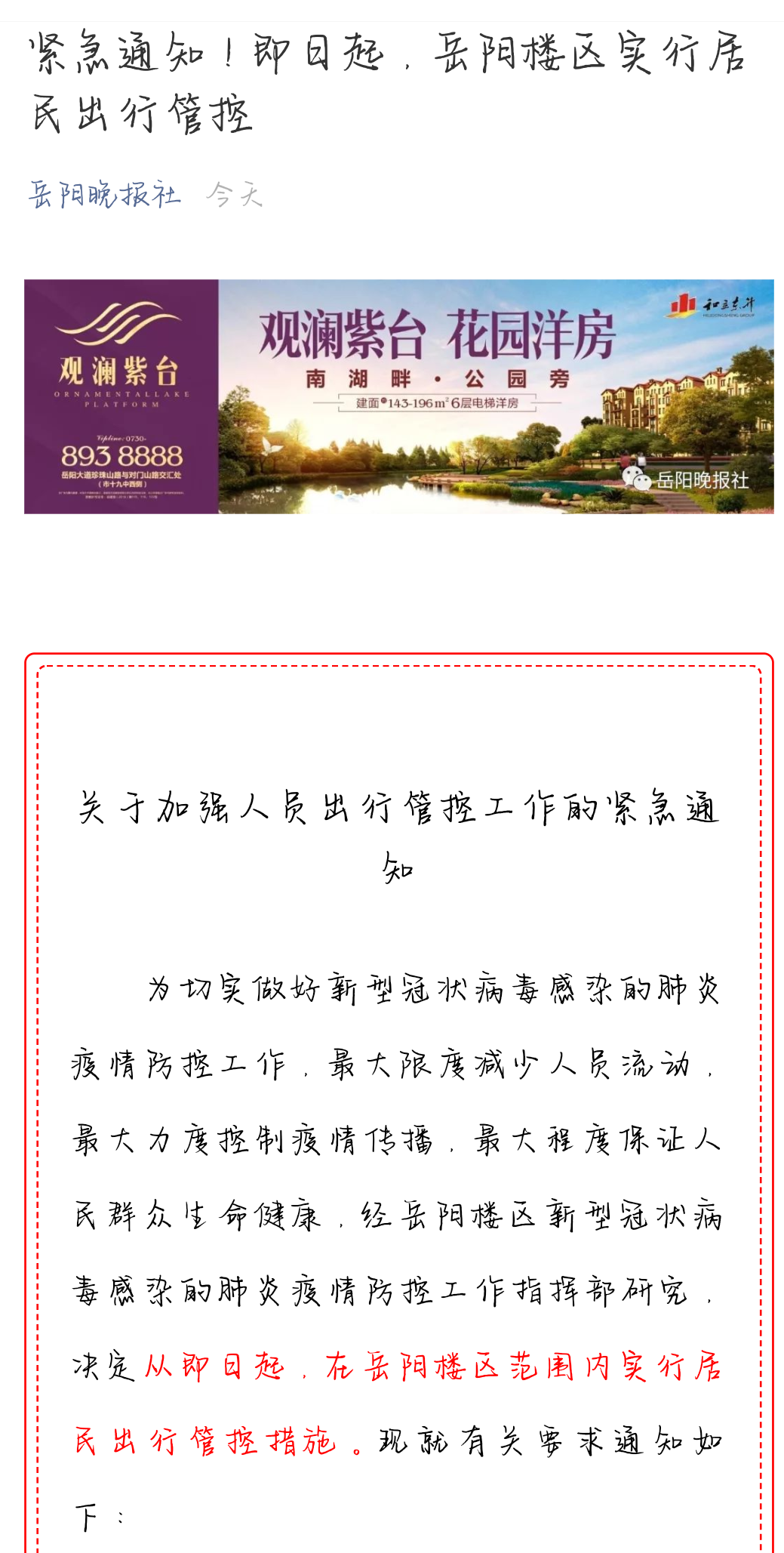 | 标题: | 岳阳楼区关于加强人员出行管控工作的紧急通知 |