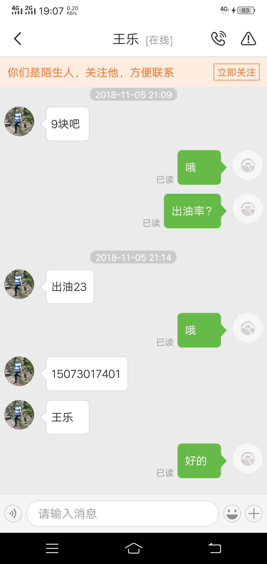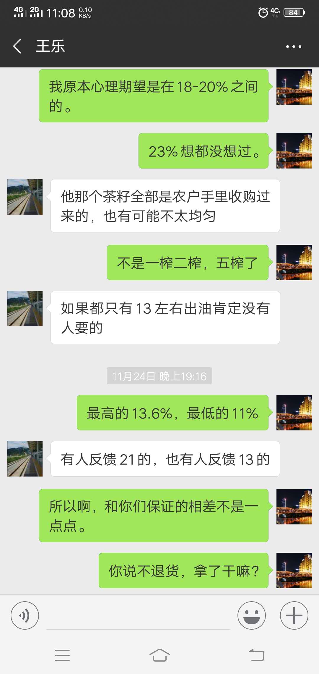 领导好!我是江西德兴这边的,2018年11月14日,通过惠农网认识了贵县杨林乡鲁丑村依贝茶油专业合作社的王乐(15073017401),经他购买了张正当(13874013859)山茶籽9220斤,每斤9元,合计82900元。购买是王乐及张正当保证确保茶籽百斤出油率为21%以上,但等回来榨了5榨最高出油率13.6%,最低12.5%,与其保证的严重不符,初步计算大概损失35000元左右。经沟通,对方不同意退货也不愿意进行相应补偿,此行为是否属于欺诈,是否可报警处理?望贵县能妥善处理为盼! 附件2:茶籽购买图片3.jpg |