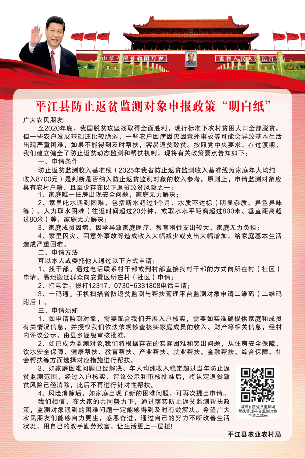 平江县2025年度防止返贫监测对象申报政策“明白纸”