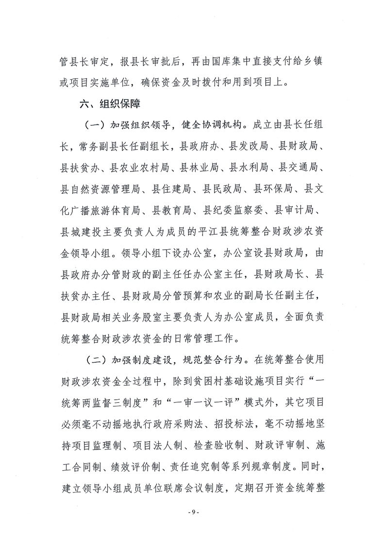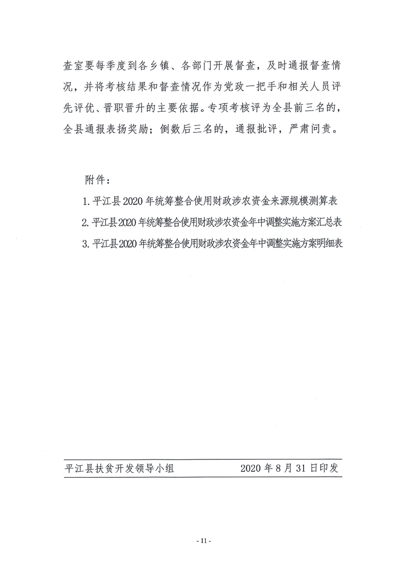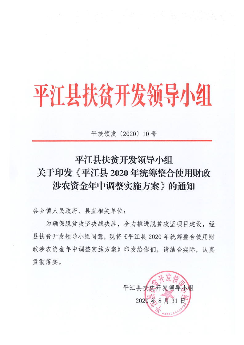 平江县扶贫开发领导小组关于印发《平江县2020年统筹整合使用财政涉农资金年中调整实施方案》的通知
