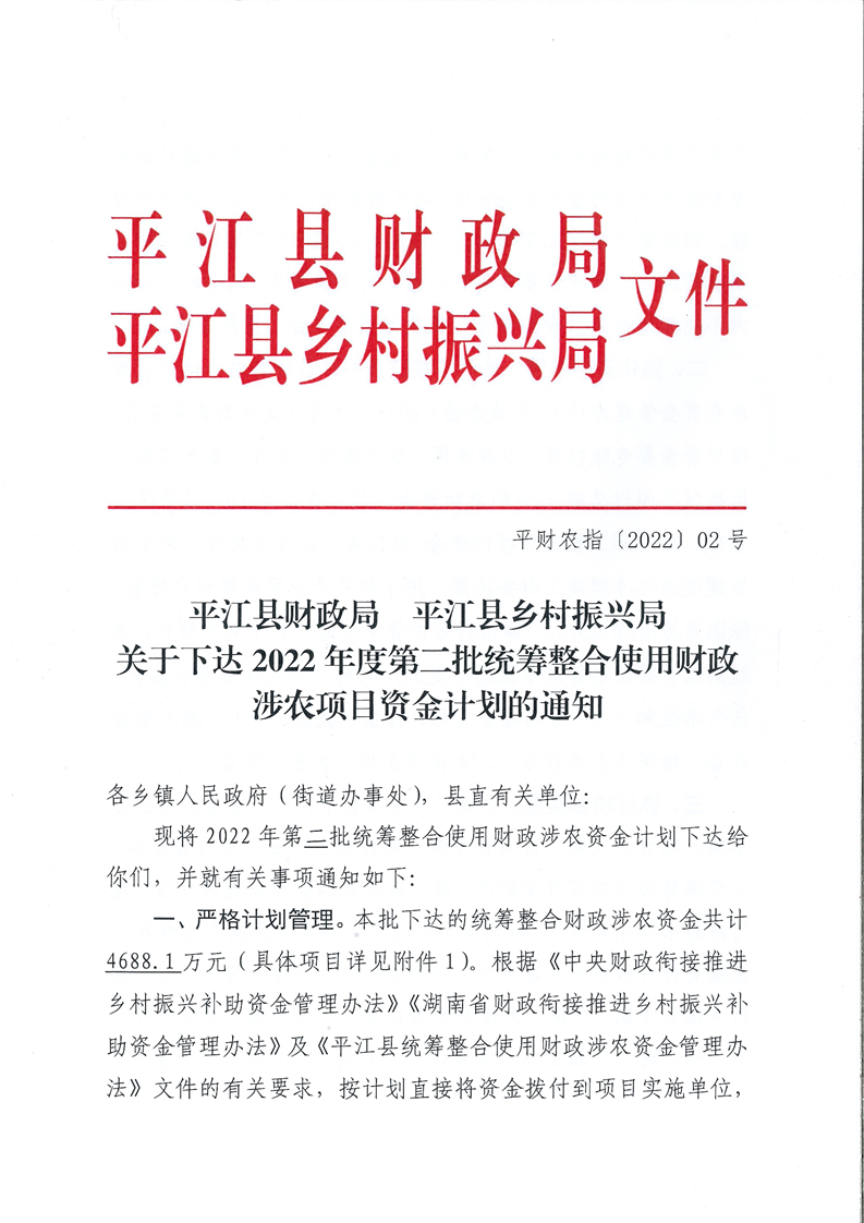 关于下达2022年度第二批统筹整合使用财政涉农项目资金计划的通知