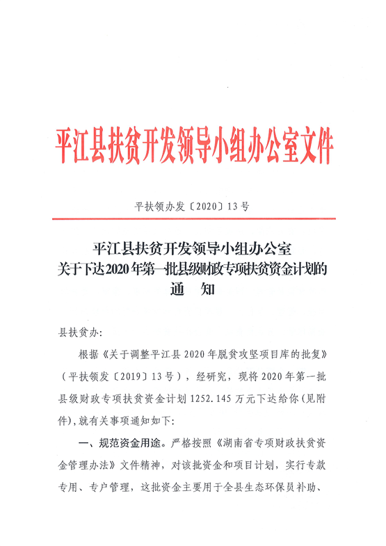 关于下达2020年第一批县级财政专项扶贫资金计划的通知