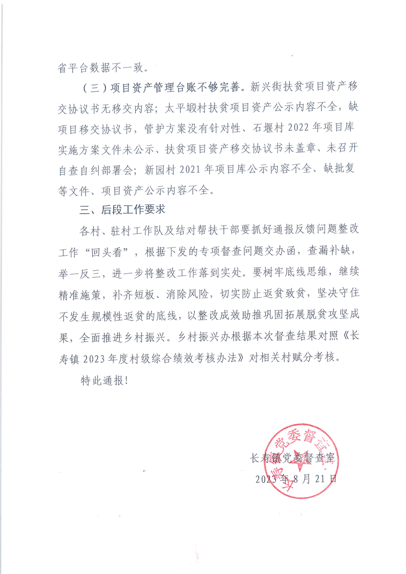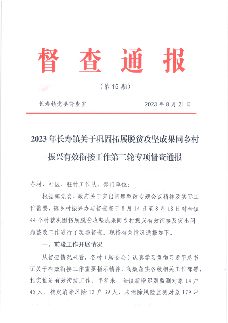2023年长寿镇关于巩固拓展脱贫攻坚成果同乡村振兴有效衔接工作第二轮专项督查通报