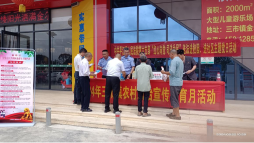 为深入学习宣传贯彻党的二十大精神,扎实推进“八五”普法工作,促进“法治乡村”建设,营造浓厚的法治宣传氛围。5月22日下午,三市镇平安办联合司法所、派出所,并特邀平江县人民法院执行局局长王晚东在辖区内开展法治宣传教育月活动。 活动现场,工作人员通过现场悬挂宣传横幅、发放宣传彩页、设立解疑咨询台等形式,结合群众的实际需求,向群众普及《中华人民共和国民法典》、《中华人民共和国未成年人保护法》等与人民群众生活息息相关的法律知识。普法志愿者对群众提出的问题现场进行答疑解惑,并结合身边的实际案例,以案释法进行讲解,广泛宣传平安建设、保守国家秘密、防范非法集资、预防电信网络诈骗等法律法规,引导群众依法维护合法权益,理性表达自身诉求,营造办事依法、遇事找法、解决问题用法、化解矛盾靠法的良好氛围。现场气氛热烈、氛围高涨,受到了群众的一致好评。