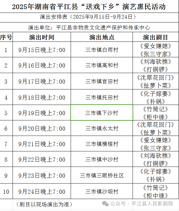 【演出预告】平江县“送戏下乡”文化惠民演出(9月15日—24日)每晚7点线上线下同步观看!