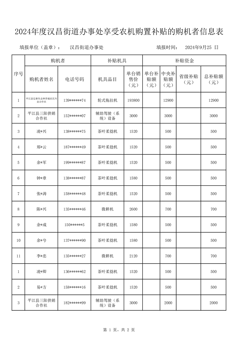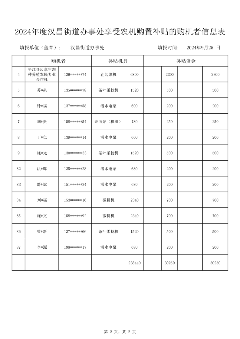 2024年度汉昌街道办事处享受农机购置补贴的购机者信息表