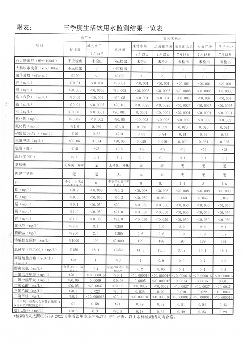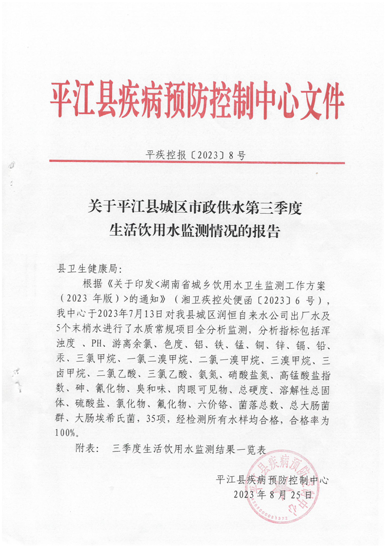平江县城区供水第三季度生活饮用水监测情况的报告
