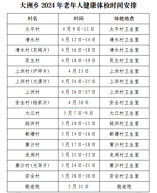 4月9日至5月31日,大洲乡将组织开展65岁及以上老年人免费健康体检活动(65岁以下的高血压、糖尿病患者及严重精神障碍患者也可参加),为老年人提供健康管理服务,具体时间、地点安排如下: