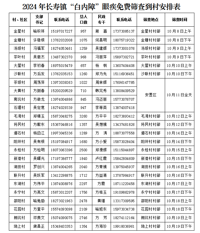 各村(居): 为了贯彻落实平江县残疾人联合会(平残发)[2024]2号文件《关于开展白内障筛查工作的通知》,为预防和减少残疾的发生,“十三五末”我国盲的年龄化患病率巳低于全球平均水平。世界卫生组织正式认证,我国仍是世界上和视觉损伤者最多的国家之一。主要致盲性眼病由传染性眼病转变为以白内障、近视性视网膜病变、青光眼、角膜病、糖尿病视网病变等为主的眼病。随着经济社会发展及人口老龄化进程加剧,人民群众对眼健康有了更高要求。提升眼科专业服务能力,为患者提供筛查—诊断—治疗—随访连续诊疗服务。发挥眼科专业医院独立作用,造福广大人员群众。组织开展眼科疾病筛查义诊、科普宣传教育是巩固拓展脱贫攻坚成果,助力乡村振兴战略计划的长效机制。县残联会同“省残疾人精准康复定点机构、”、”国家光明扶贫工程定点医院”平江光明眼科医院,以便民、利民、惠民为宗旨,组织专业医务人员进乡镇下村居,对眼疾病人开展免费筛查,对筛查出来的白内障患者实施免费治疗(免费范围:指项目指定晶体、免检查检验费、药费、手术费耗材费等。如患者病情需要或自愿选用非指定项目晶体,超出费用差价部分患者自负)。做好这次白内障筛查工作是预防眼疾的重要手段,是巩固脱贫攻坚成果的有效方法,各村、居、社区务必高度重视,密切配合,做到眼疾患者筛查全覆盖,具体做好以下几个方面的工作: 1、统一思想,提高认识。开展“白内障”眼疾筛查,是党和政府的一项惠民工程,是解除广大眼疾患者痛苦、提高广大眼疾患者幸福指数的好方法,是巩固拓展脱贫攻坚成果、助力乡村振兴的重要有力举措。 2、深入宣传,广泛发动。各村(居)接此通知后,要召开支村居两委,村居民小组长会议,利用村村响、村民微信、村卫生室要密切配合,进行广泛宣传发动,做到家喻户晓。 3、落实责任,加强考核。办村干部要协助支村两委做好工作、村居民政专干具体抓,围绕两率,一是进站筛查率,重点以50岁以上中老年人群为主,筛查人员进站率力争不少于总人口的3%。二是病人进院复查率,对筛查出疑似眼疾病人督促一个月内进院复查就诊,复查就诊率达80%。白内障筛查进站率和初筛病人进院复查就诊率将纳入全年目标管理考核。 4、认真组织,密切配合。各村(居)要按筛查要求通知参加筛查人员佩戴口罩,带本人身份证并提供本人或家属联系电话,与定点医院筛查工作人员紧密配合,组织好眼疾患者按统一时间,到各村、居、社区便民中心参加筛查(居住在本辖区内的县直部门企事业单位退休人员都可参加筛查,并享受与村居民一样政策待遇)。筛查时间上午8点至11点半,下午1点半至4点半。筛查期间上午的村请安排好筛查人员的工作便餐。 民政办联系人电话:15074096523(龚) 医院工作人员电话:18390041027(欧)15973048666(张) 附件:1、关于全面开展“白内障”眼疾免费筛查的通知 2、2024年长寿镇“白内障”眼疾免费筛查到村时间安排表 2024年9月26日 附:光明眼科医院位置二维码、医院公众号 ![]()
