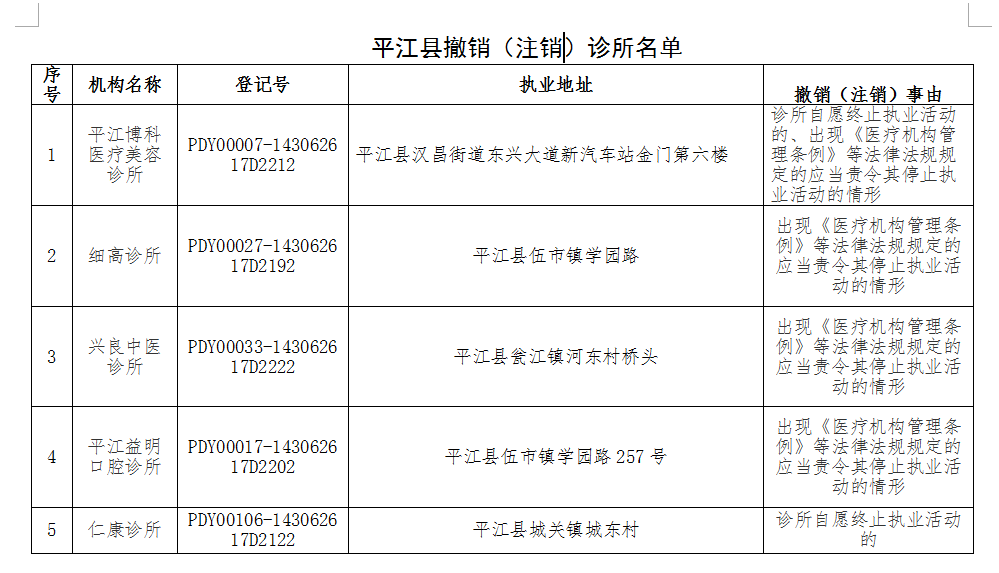 关于撤销(注销)平江博科医疗美容诊所等五家诊所备案凭证的公示