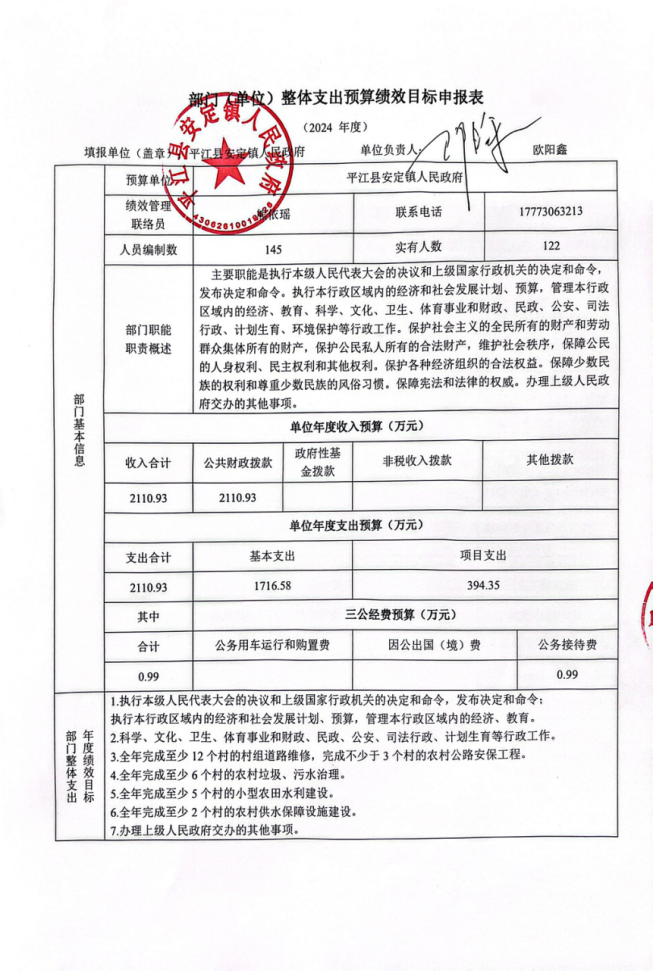 第一部分 平江县安定镇政府2024年部门预算说明