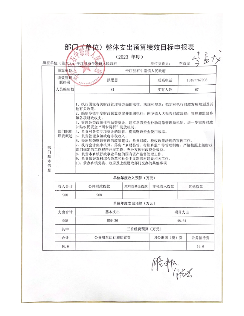 平江县石牛寨镇2023年部门预算公开说明及预算目标绩效编制公示