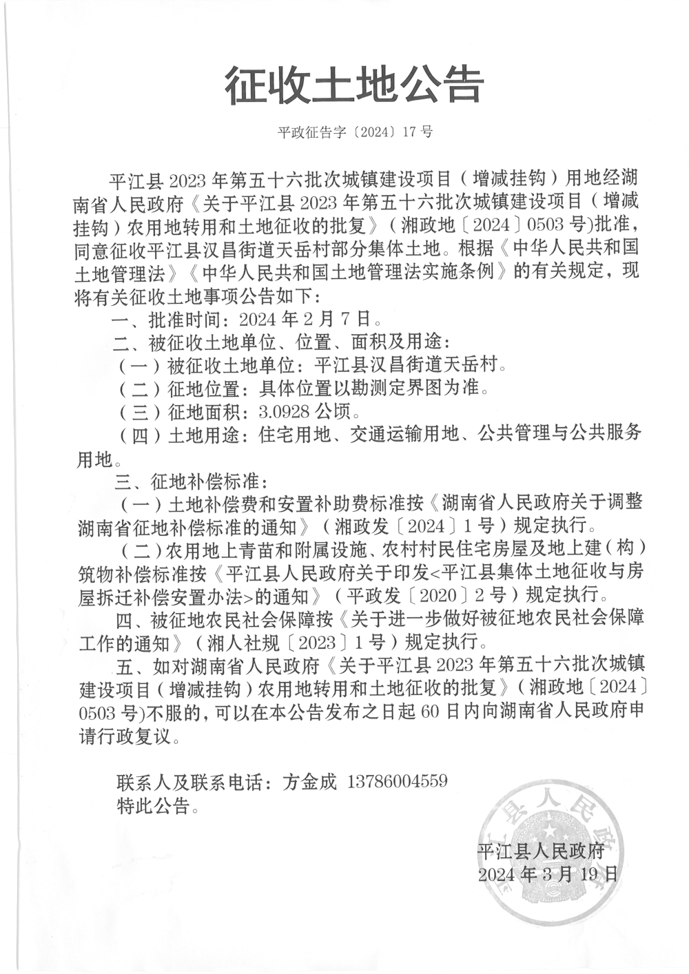 | 公开依据 | 《土地管理法》、《征收土地公告办法》 | ||