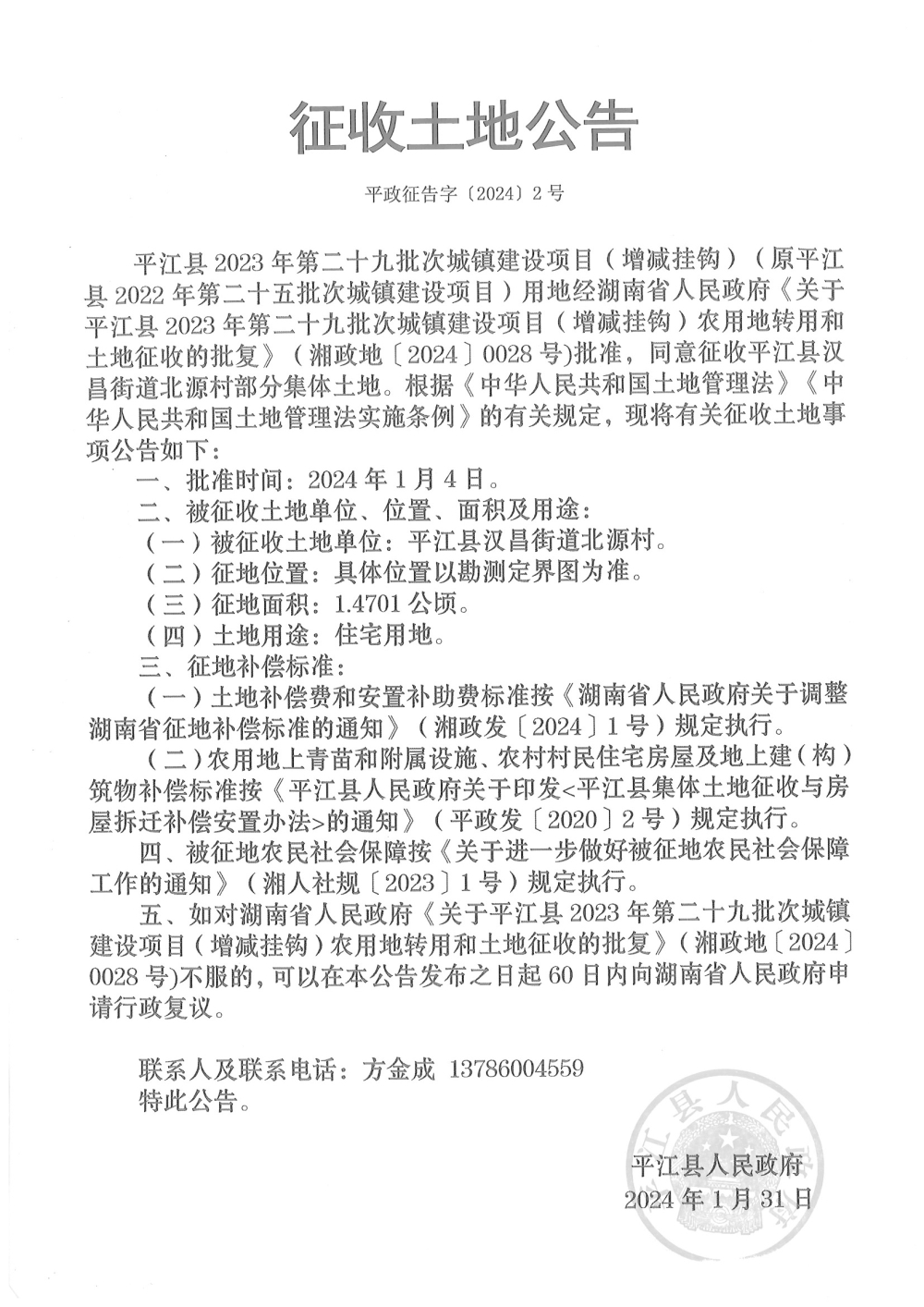 平江县2023年第二十九批次城镇建设项目(增减挂钩)征收土地公告