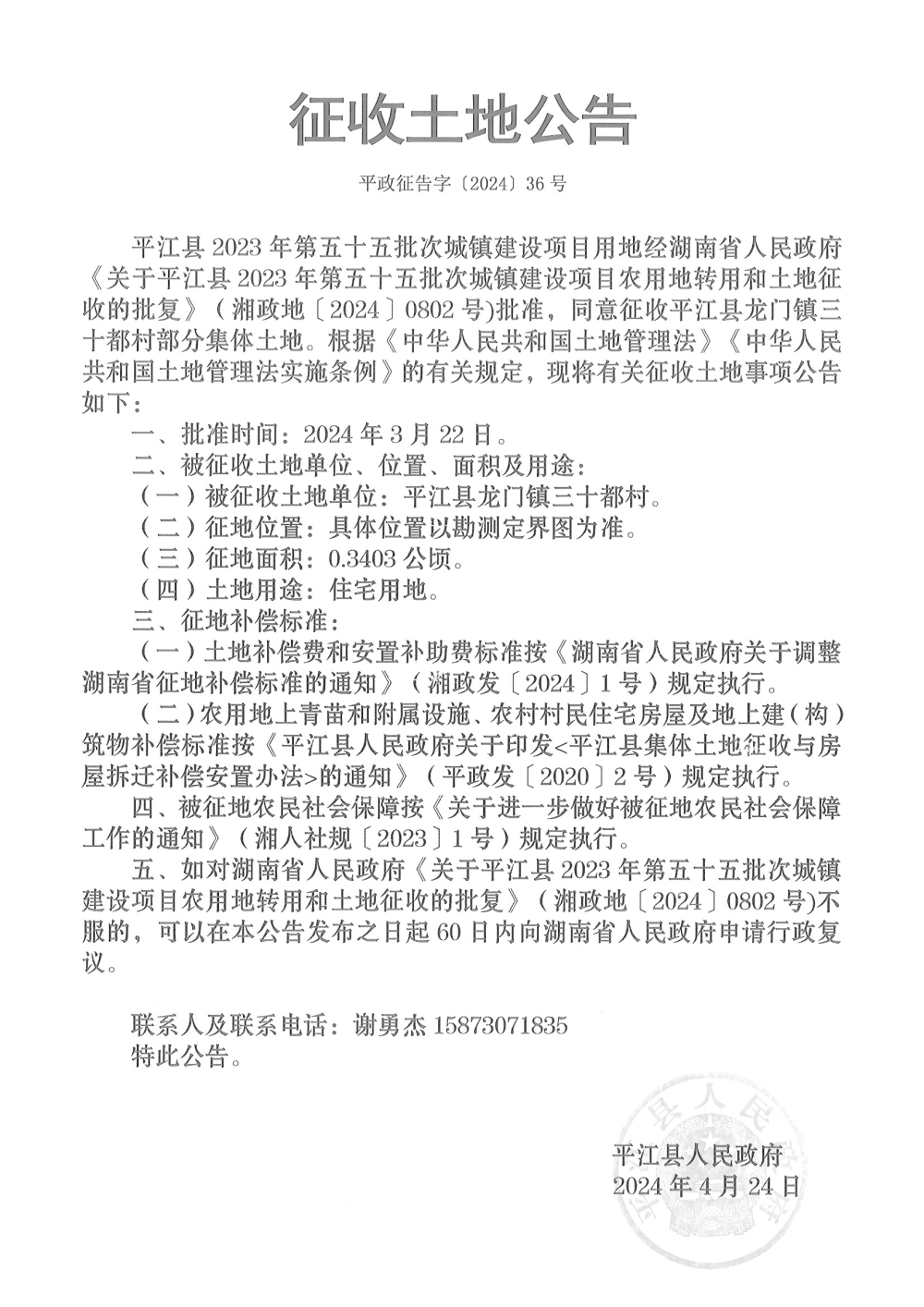 平江县2023年第五十五批次城镇建设项目征收土地公告