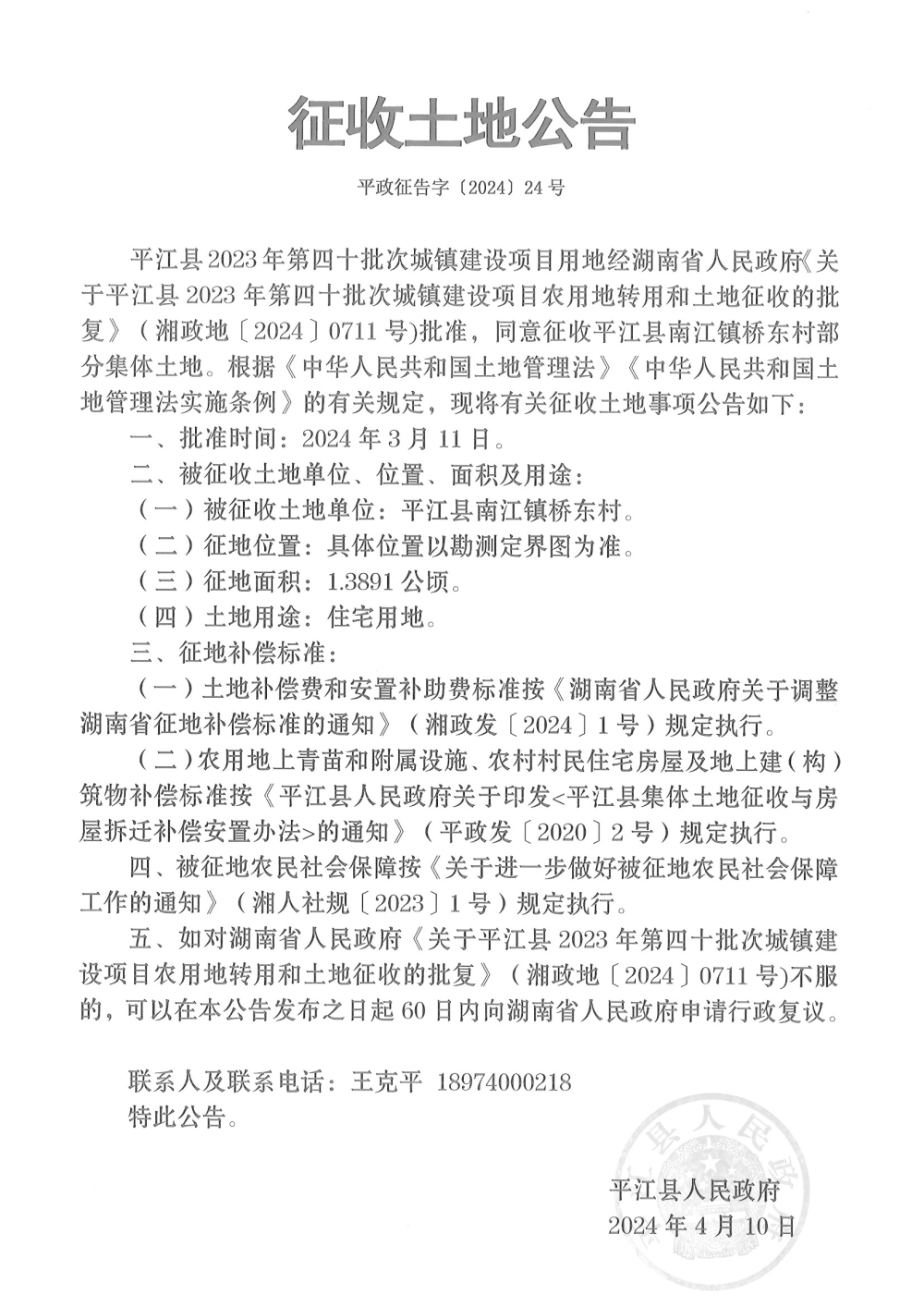平江县2023年第四十批次城镇建设项目征收土地公告