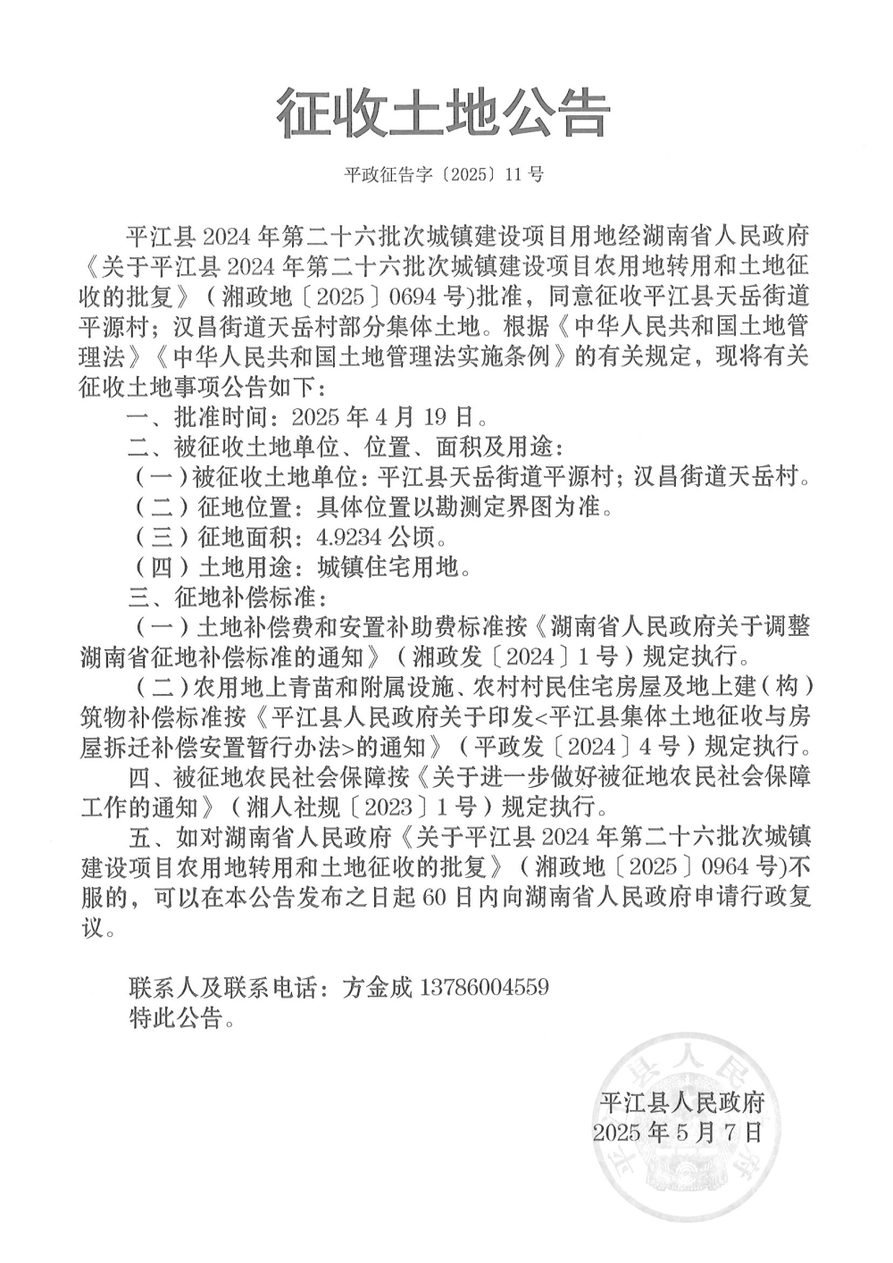 平江县2024年第二十六批次城镇建设项目征收土地公告