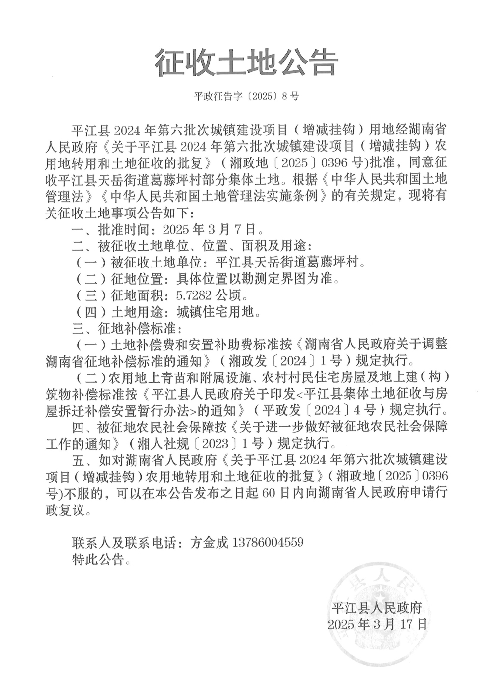 关于平江县2024年第六批次城镇建设项目(增减挂钩)征收土地公告
