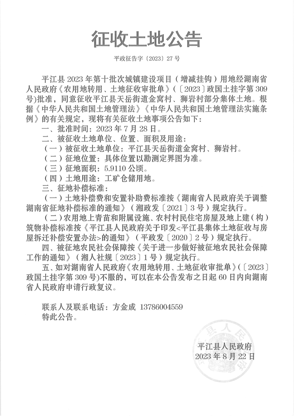 平江县2023年第十批次城镇建设项目(增减挂钩)征收土地公告