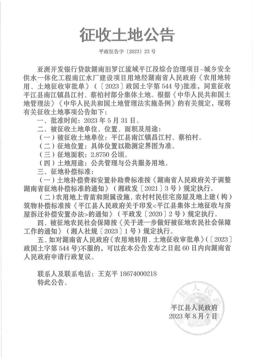 亚洲开发银行贷款湖南汨罗江流域平江段综合治理项目—城乡安全供水一体化工程南江水厂建设项目