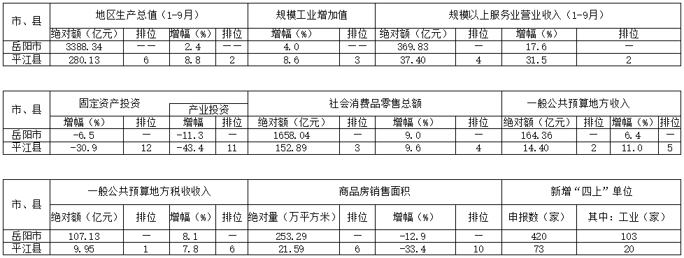2023年1—10月岳阳市平江县主要经济指标