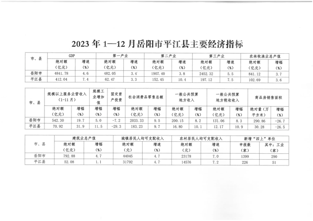 2023年1-12月岳阳市平江县主要经济指标