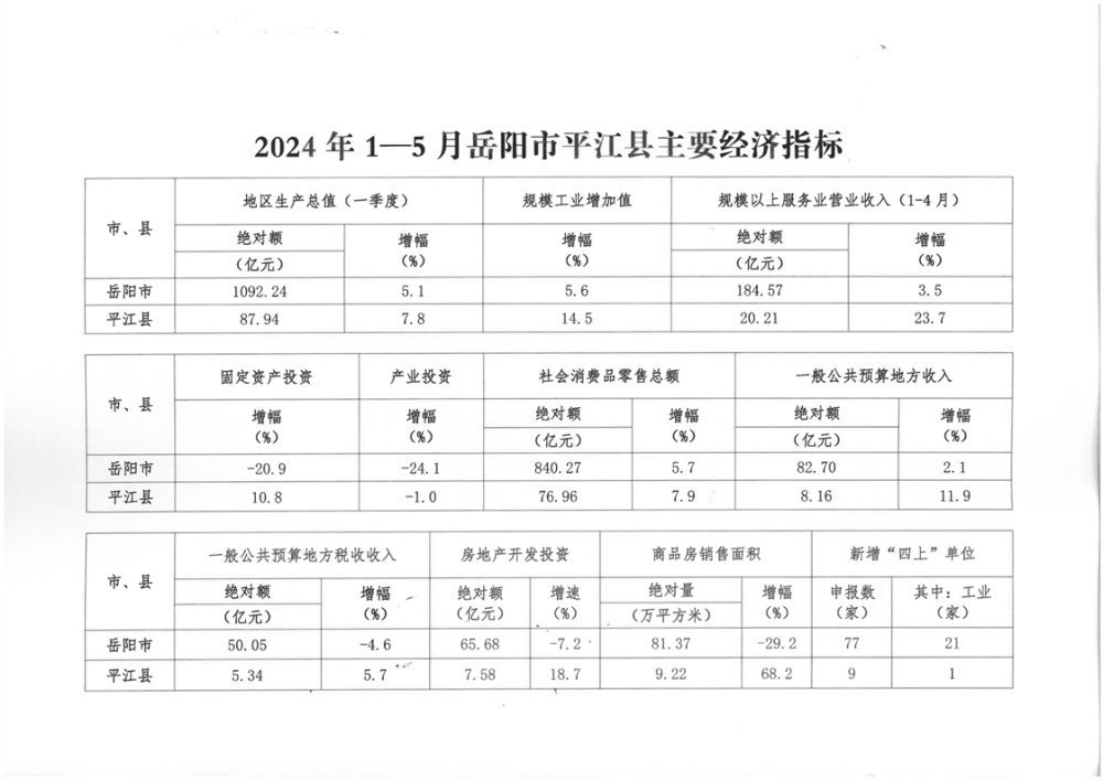 2024年1-5月岳阳市平江县主要经济指标