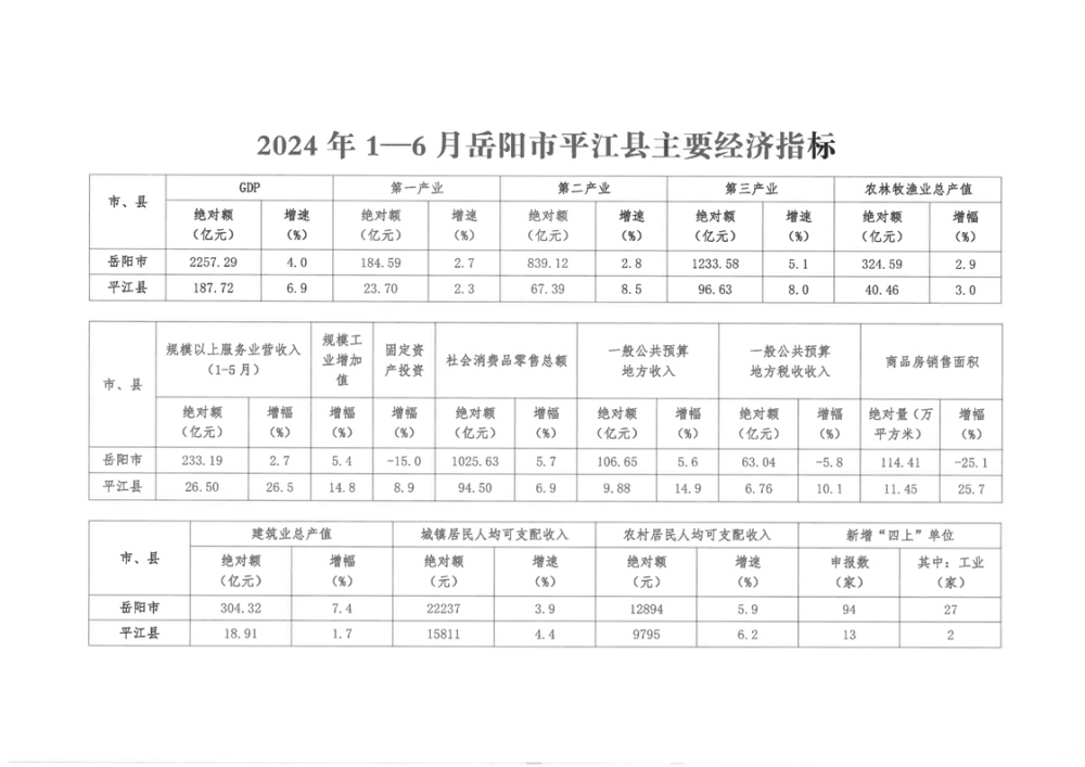 2024年1-6月岳阳市平江县主要经济指标